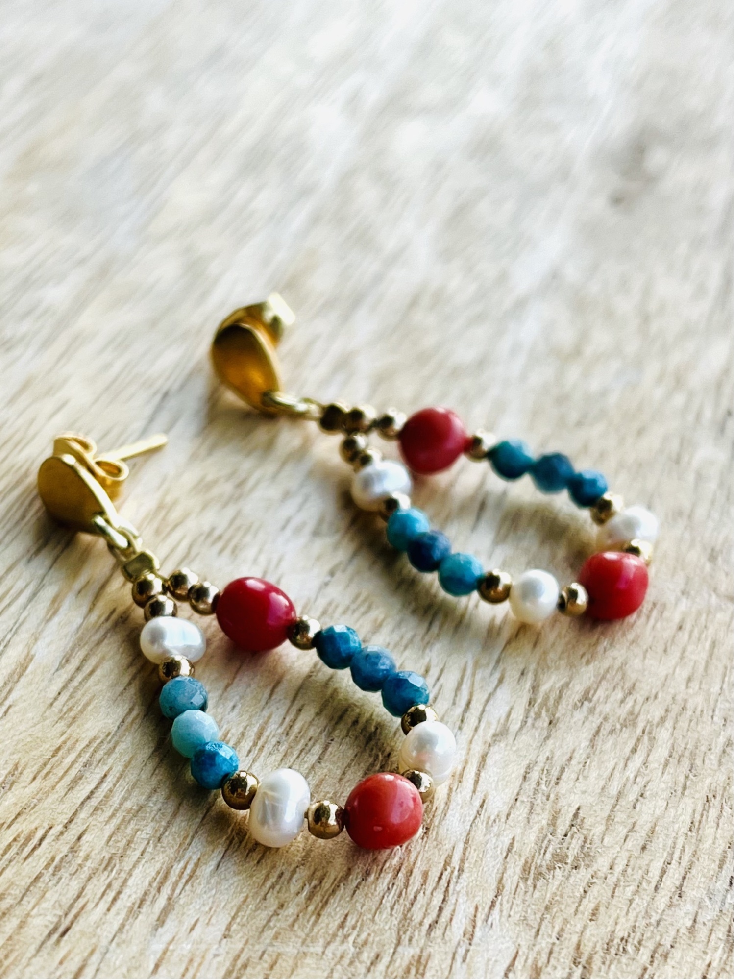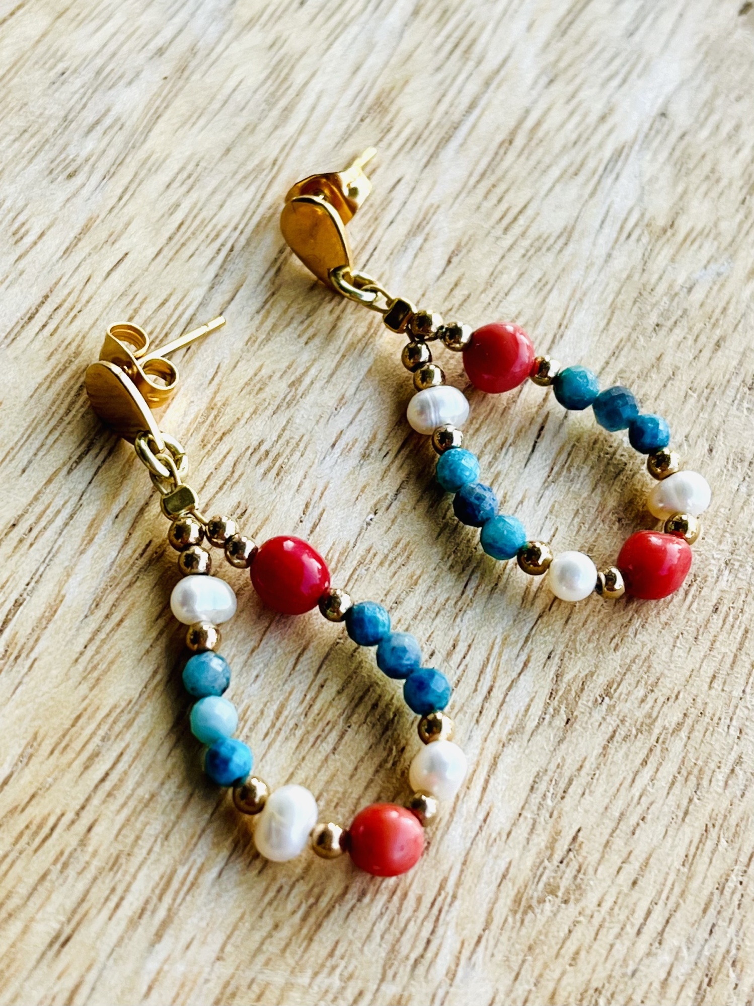 Kolczyki Łezki Chryzokola z Perełką i Czerwonym Koralem