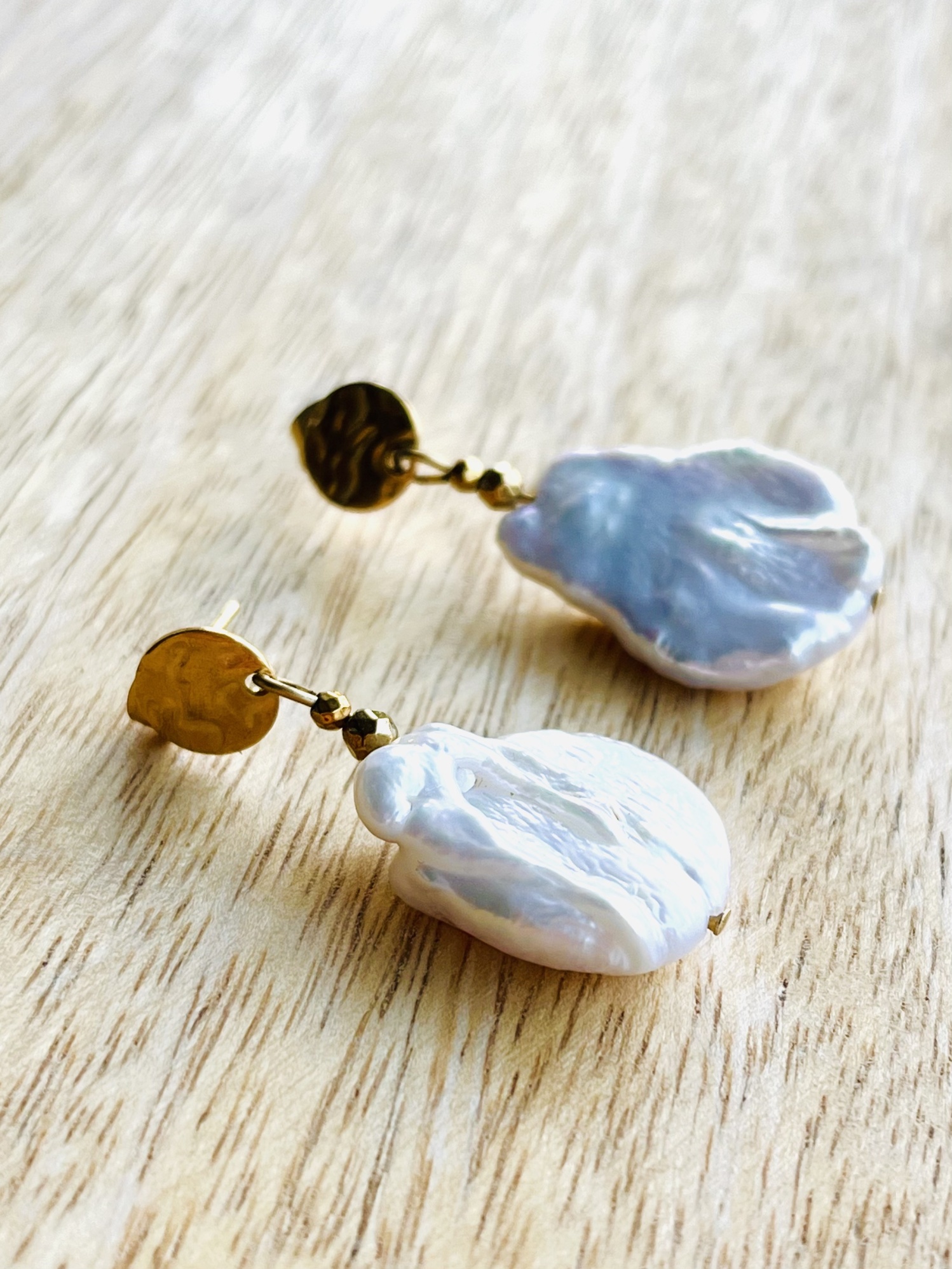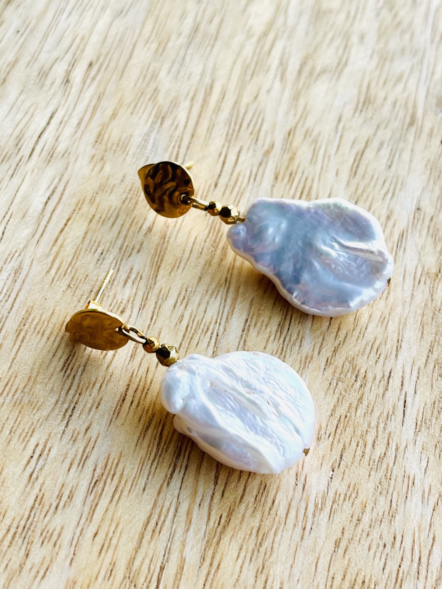 Kolczyki wiszące z dużą nieregularną perłą oraz złotym hematytem. Sztyft blaszka ze stali chirurgicznej. Długość 3cm.
