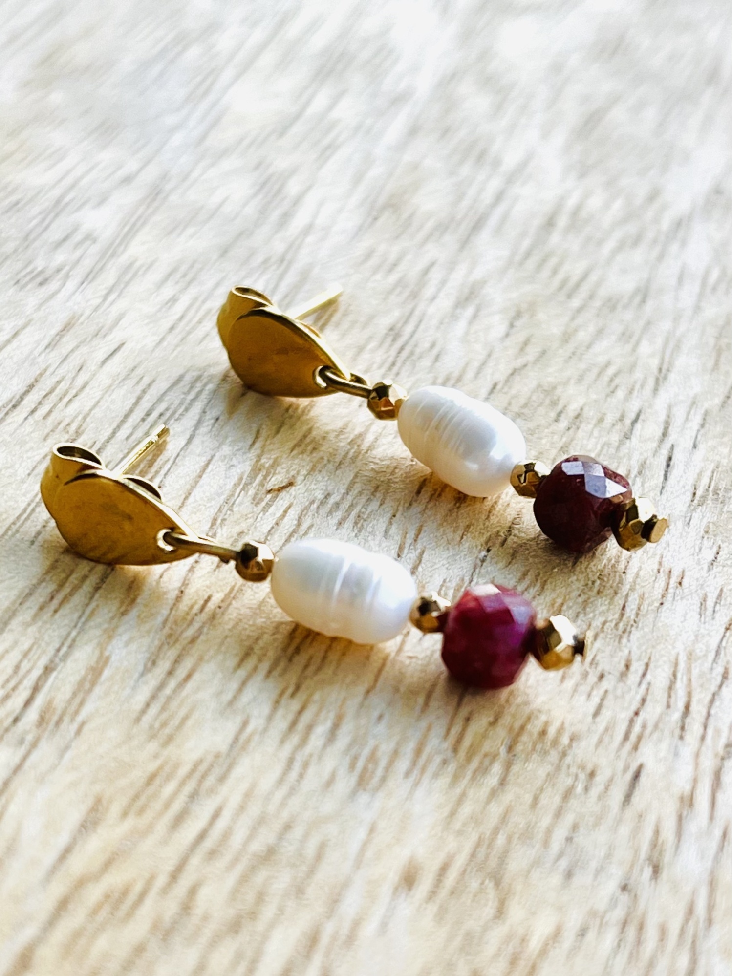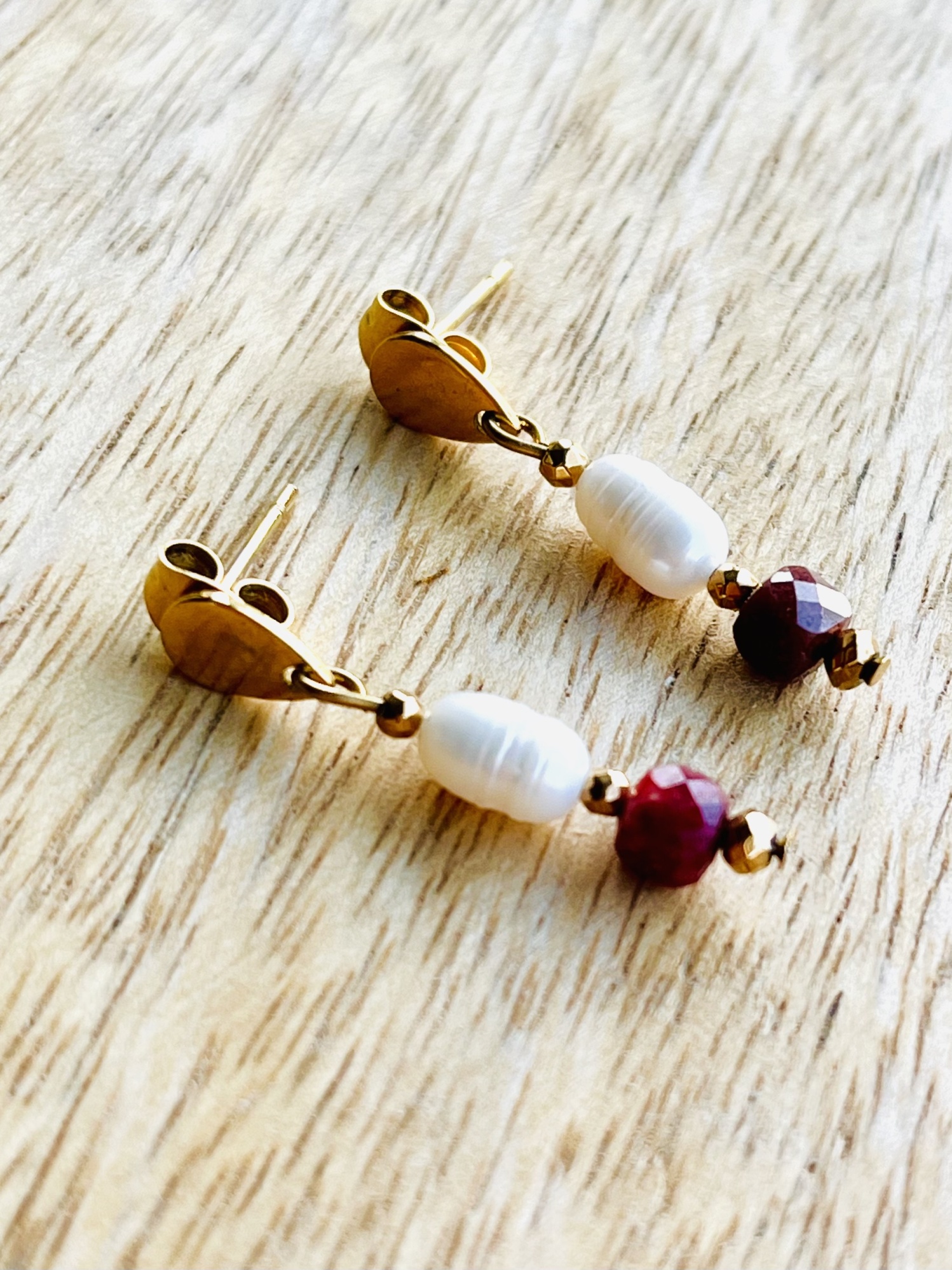 Kolczyki wiszące z białą nieregularną perełką, bordowym rodonitem oraz złotym hematytem. Sztyft łezka ze stali chirurgicznej. Długość ok 2cm.