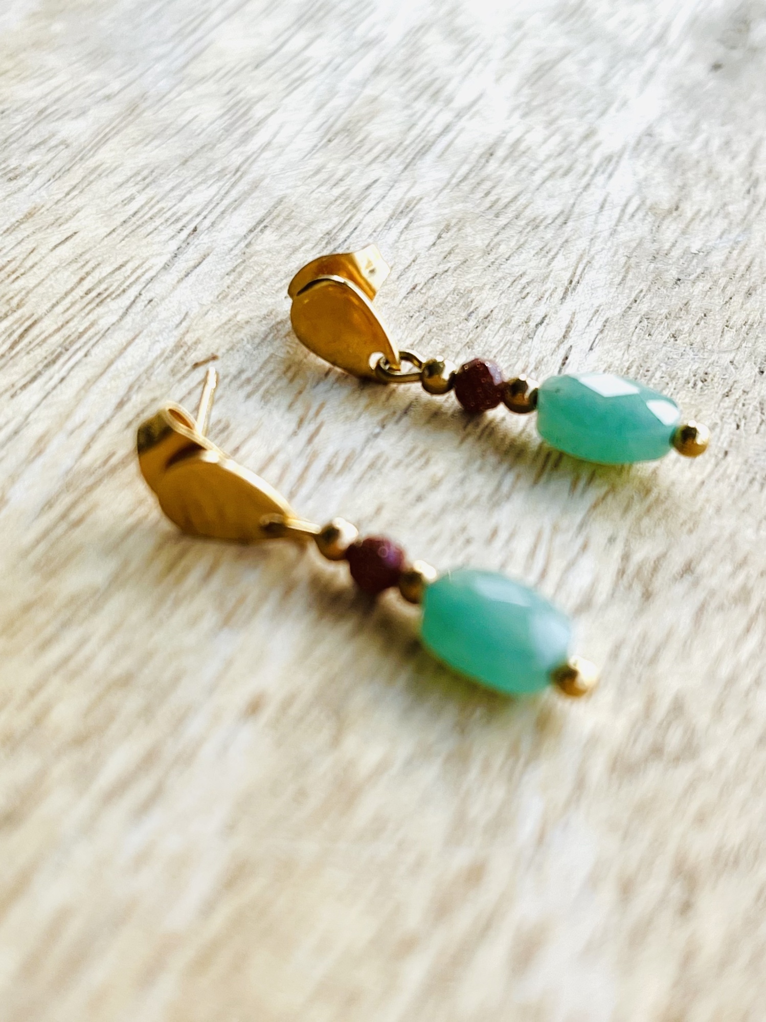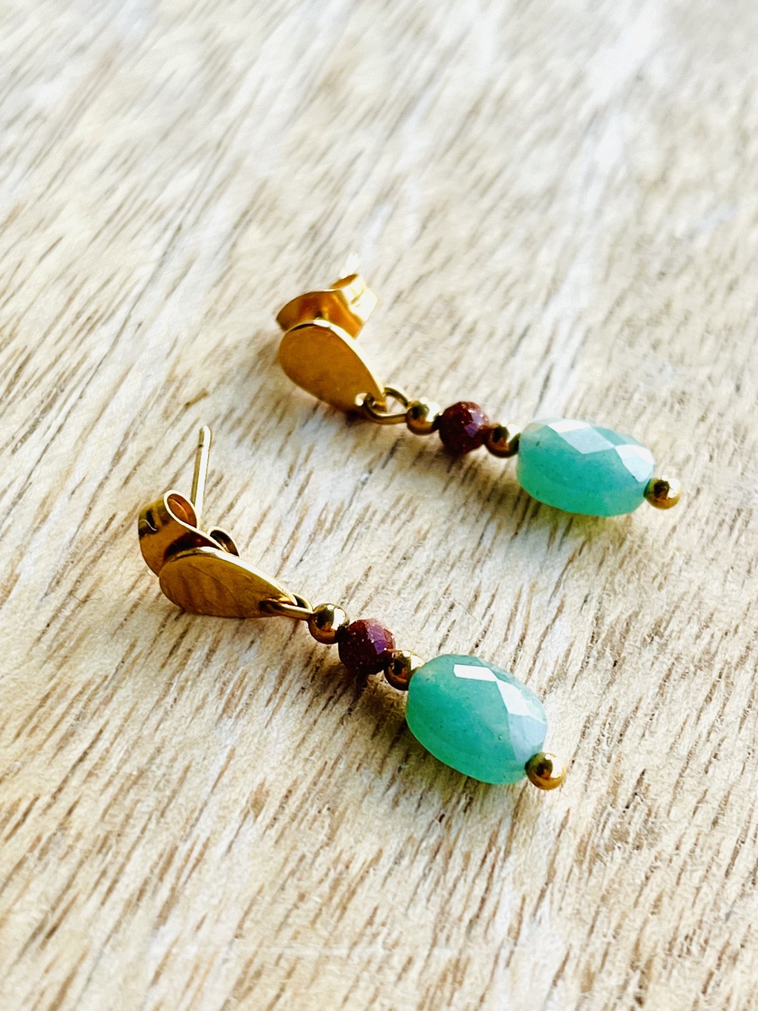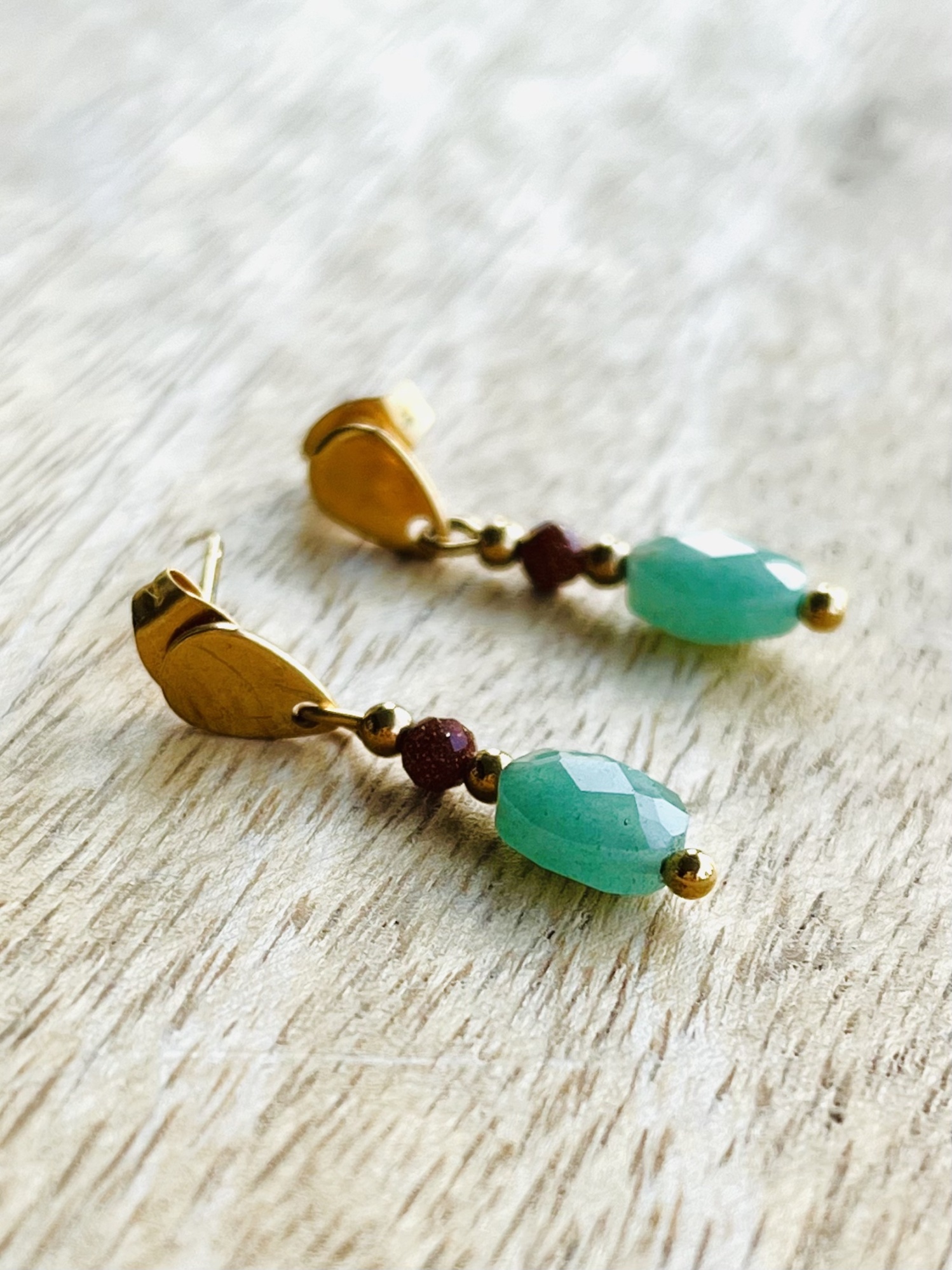 Kolczyki wiszące z zielonym awenturynem, piaskiem pustyni oraz złotym hematytem. Sztyft łezka ze stali chirurgicznej. Długość ok 2cm.
