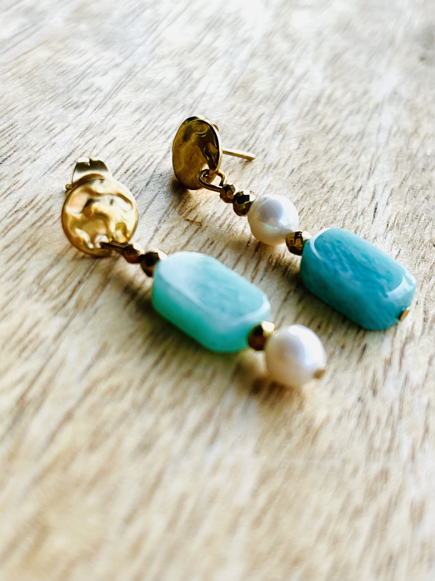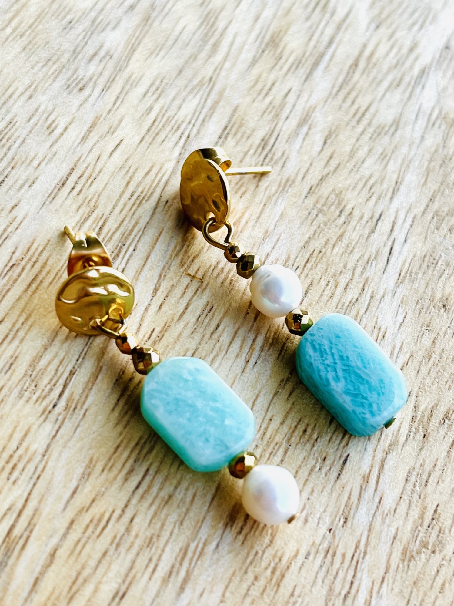 Kolczyki wiszące z błękitnym amazonitem, białą nieregularną perełką oraz złotym hematytem. Sztyft blaszka ze stali chirurgicznej. Długość ok 2,7cm.