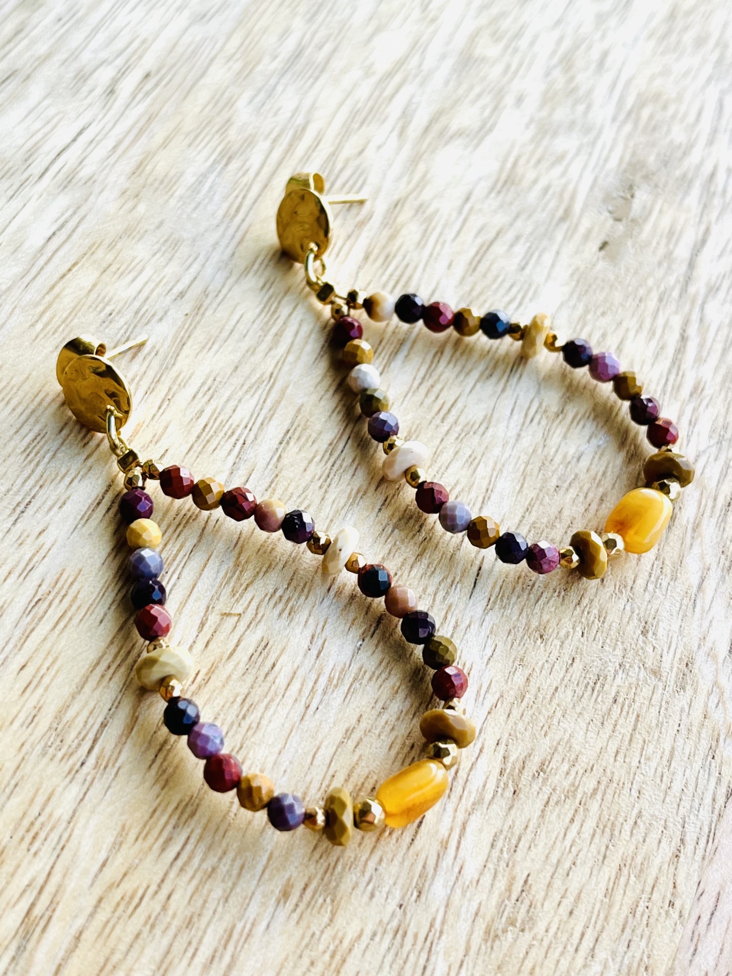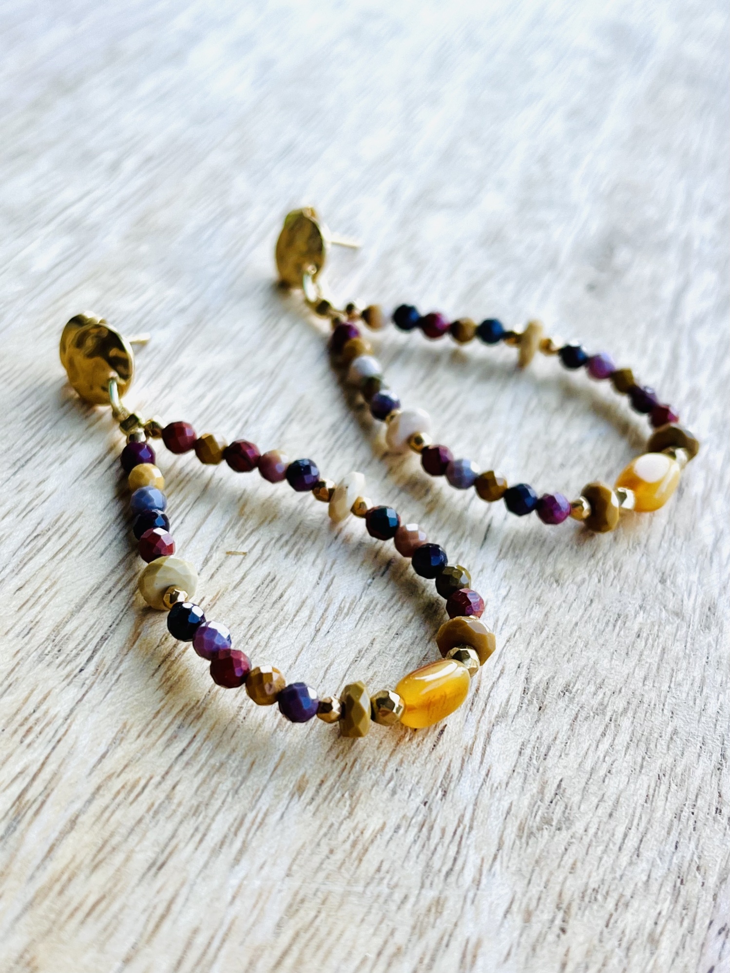 Kolczyki wiszące w kształcie łezki z bursztynkiem, kamieniami mokaitu oraz złotego hematytu. Sztyft blaszka ze stali chirurgicznej. Długość łezki 4,5cm.