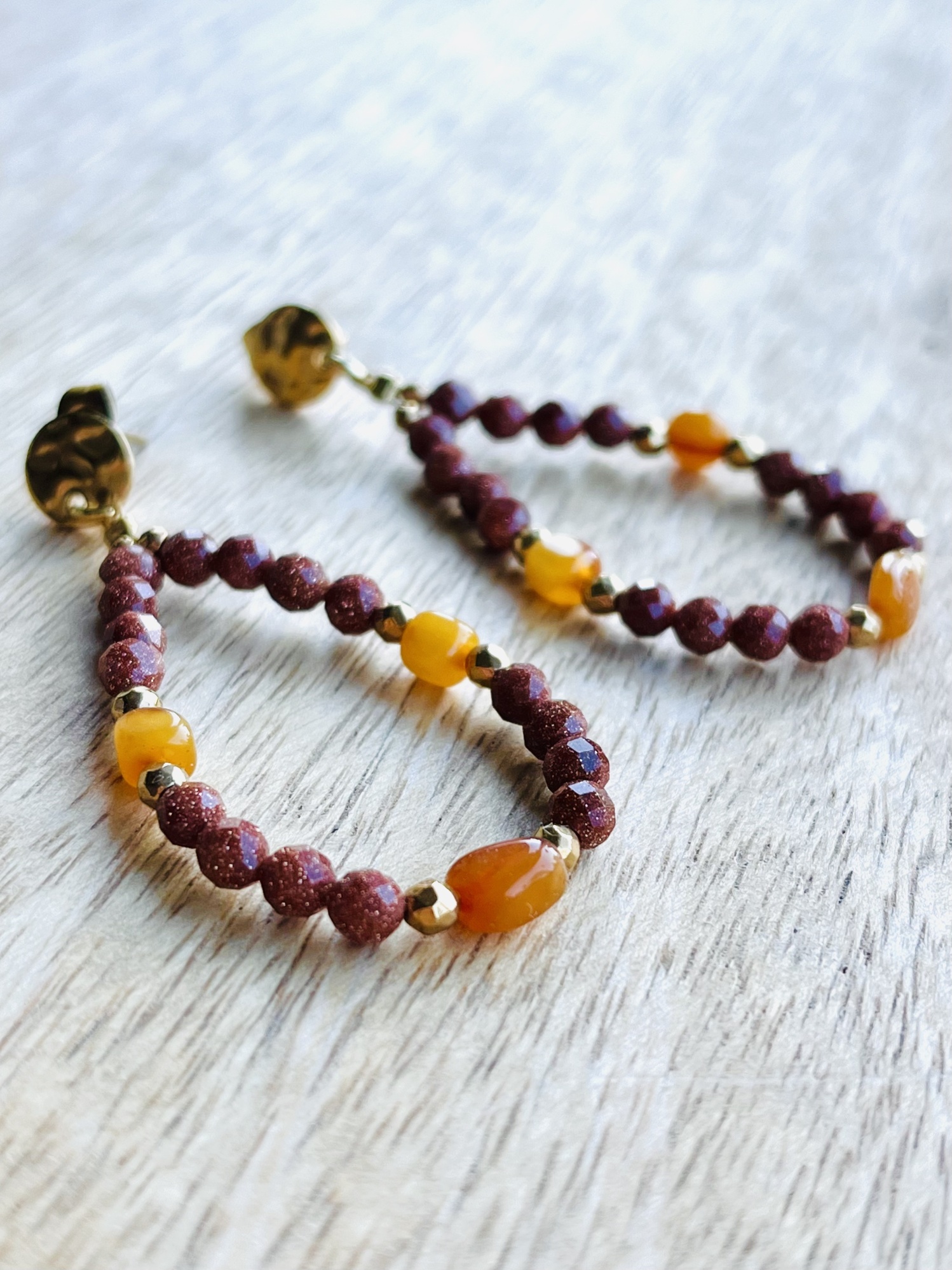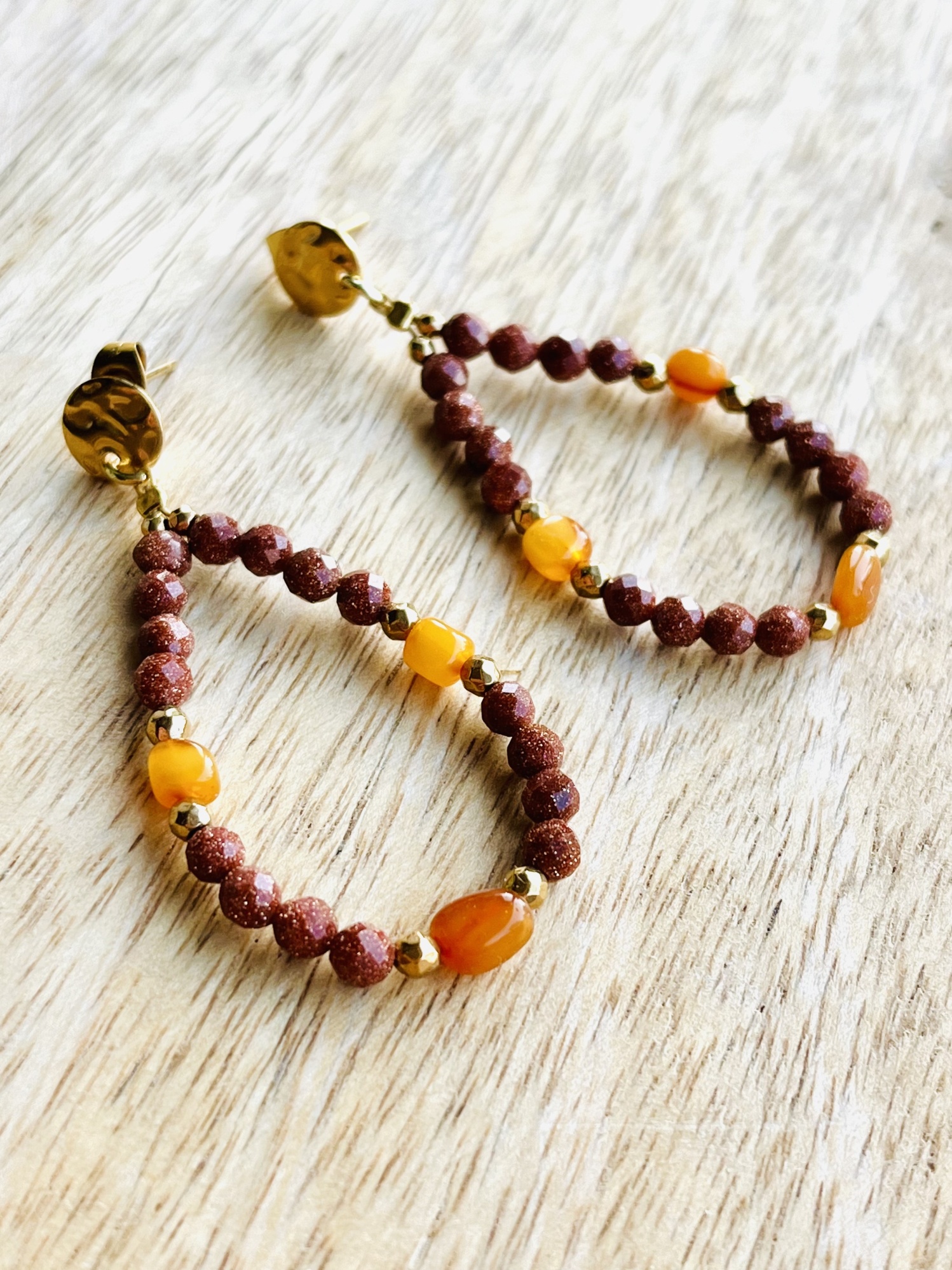 Kolczyki wiszące w kształcie łezki z bursztynkiem, piaskiem pustyni oraz złotym hematytem. Sztyft blaszka ze stali chirurgicznej. Długość łezki 4,5cm.