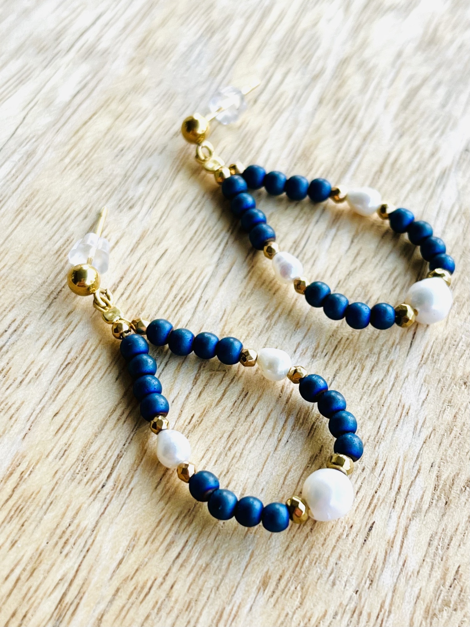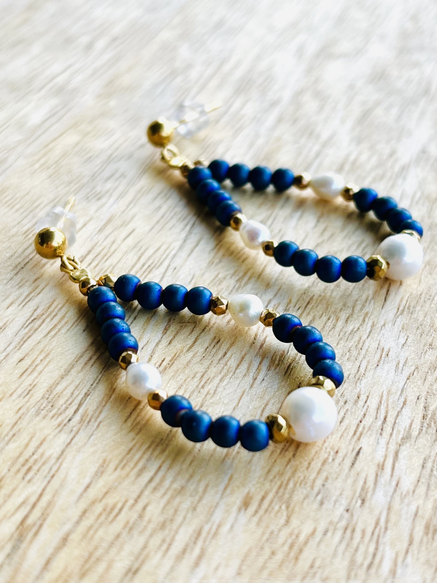 Kolczyki wiszące w kształcie łezki z białą perełką, granatowym i złotym hematytem. Sztyft kuleczki ze stali chirurgicznej. Długość łezki 4cm.