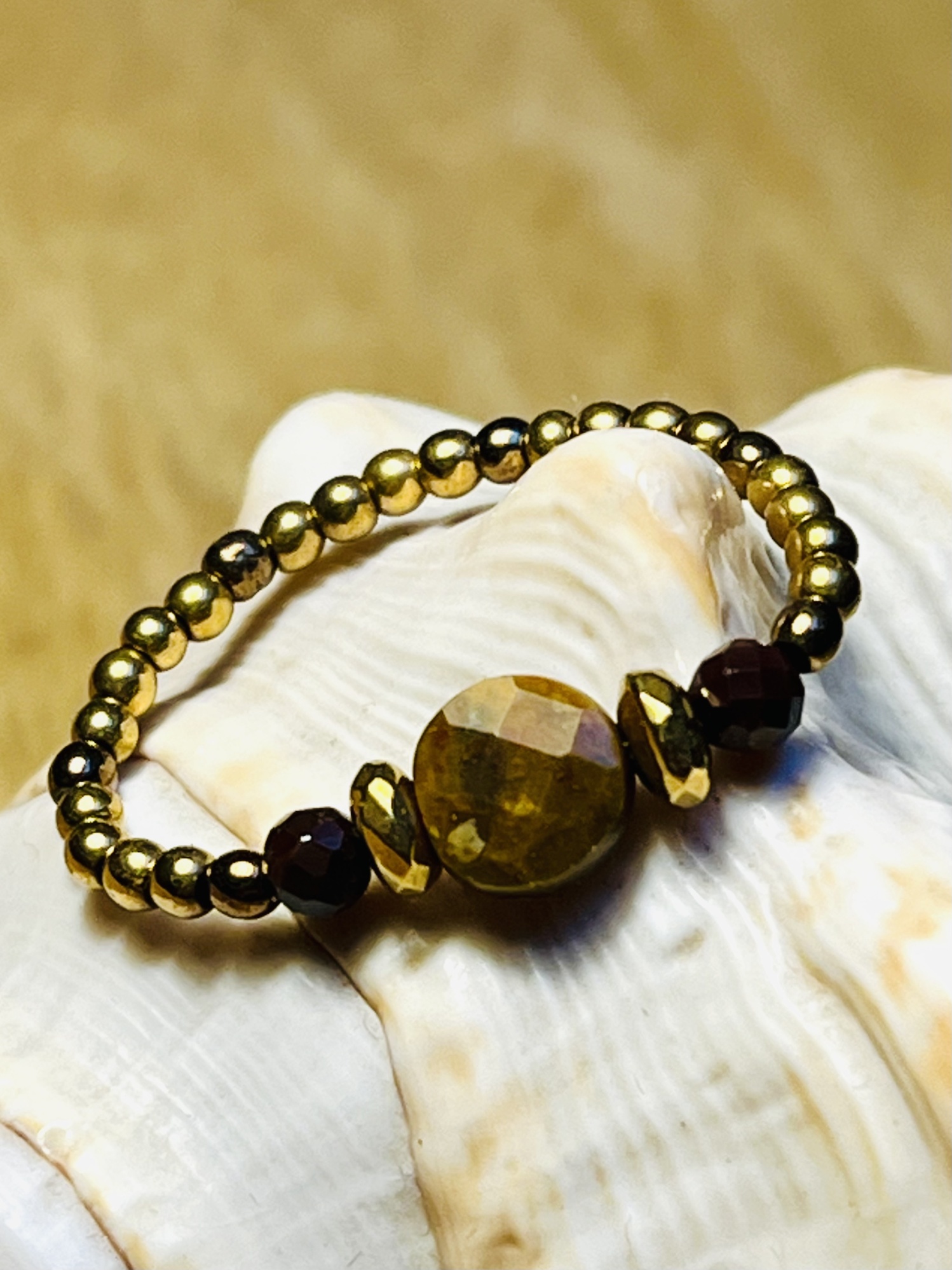 Pierścionek elastyczny wykonany z dużą pastylką agatu w odcieniach brązu w otoczeniu mokaitu oraz z dodatkiem brązowego i złotego hematytu.
