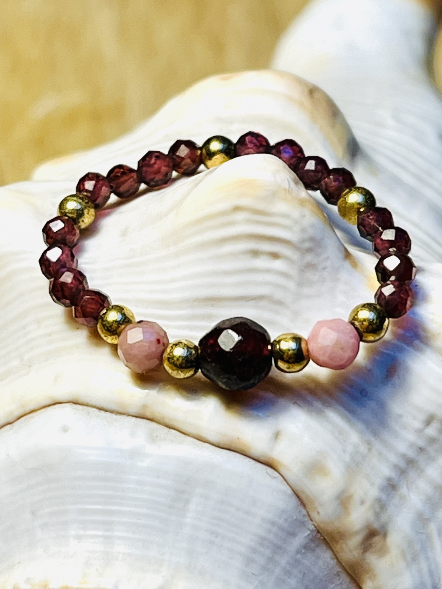 Pierścionek elastyczny wykonany z kamieni bordowego granatu, różowego rodonitu z dodatkiem złotego hematytu.