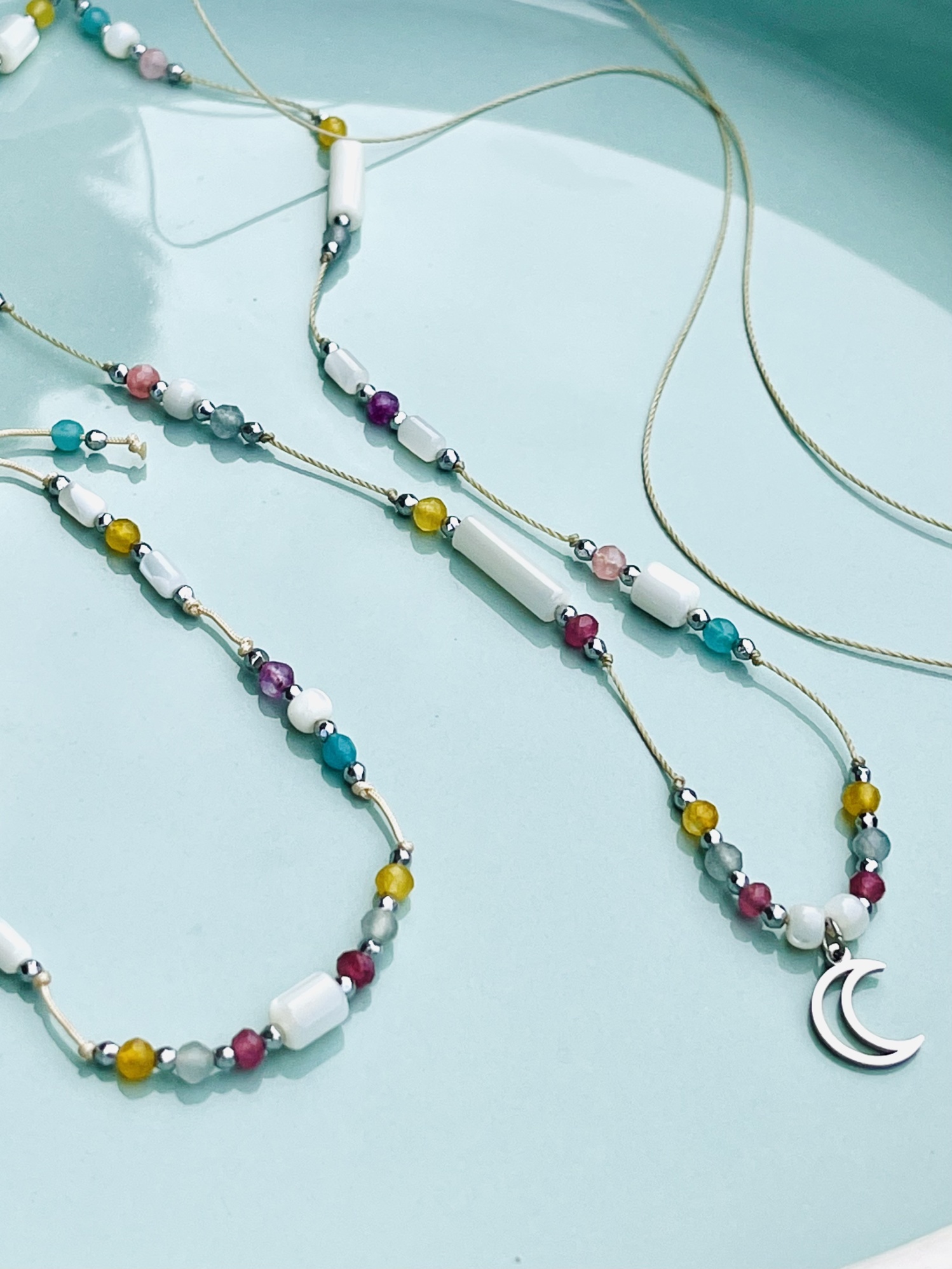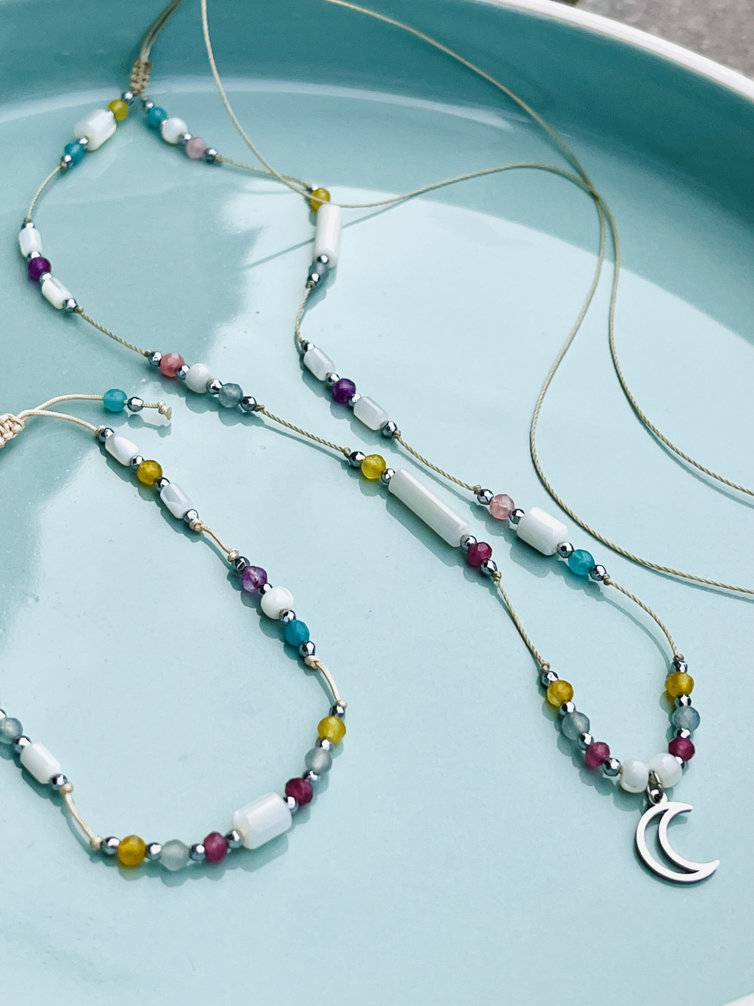 Regulowany komplet z zawieszką Księżyca w odcieniu srebrnym w otoczeniu masy perłowej, kolorowych jadeitów oraz srebrnego hematytu. Wykonany na jasnym nylonowym sznureczku. Naszyjnik regulowany za pomocą makramy. Możemy uzyskać naszyjnik krótki, średni, długi w zależności od naszych potrzeb.