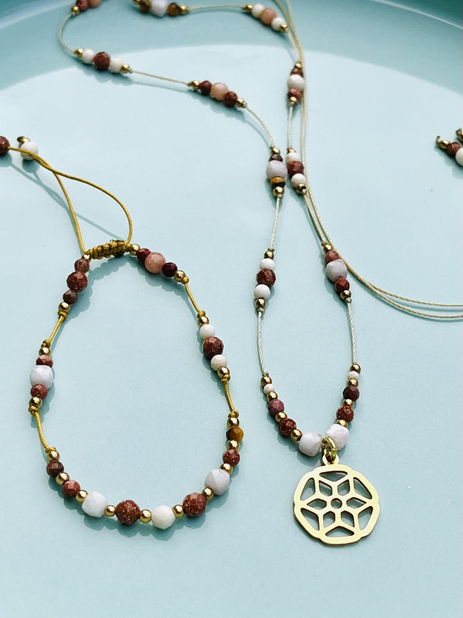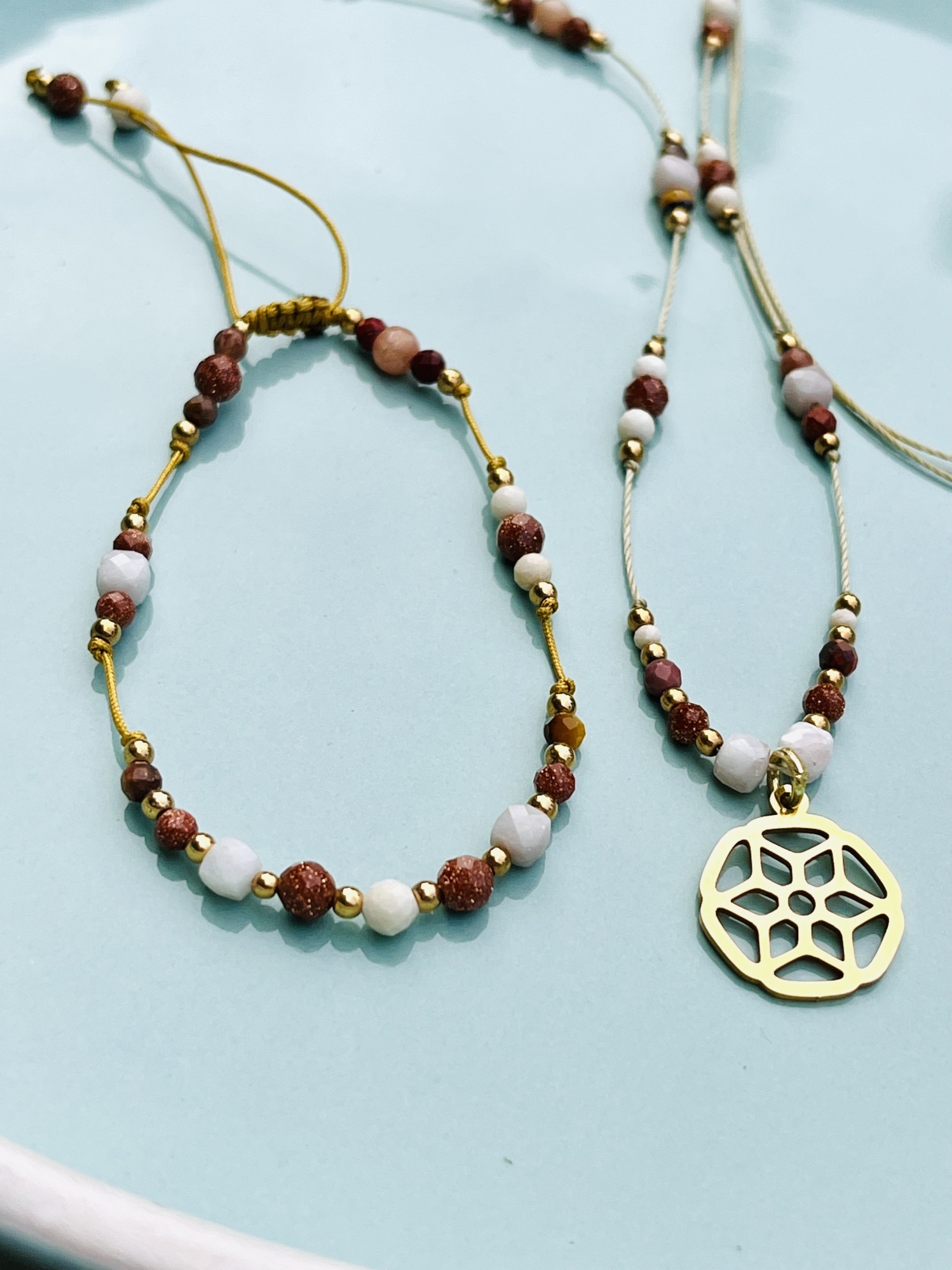 Regulowany komplet z zawieszką Kwiatka mandali ze stali chirurgicznej w złotym odcieniu w otoczeniu kamieni opalu, jaspisu, tygrysiego oka, piasku pustyni, kamienia rzecznego, jadeitu oraz złotego hematytu.