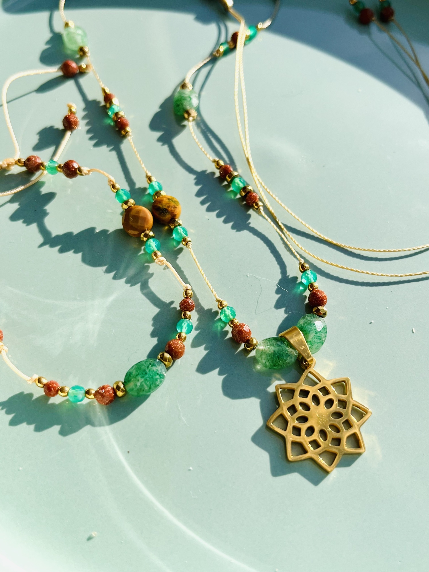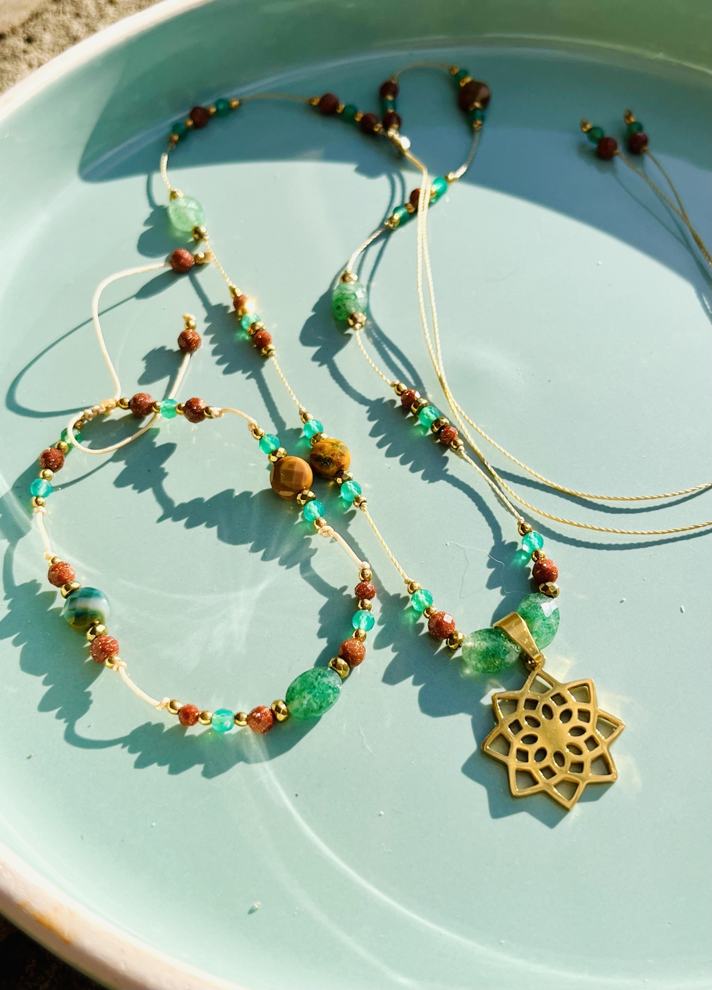 Regulowany komplet z zawieszką Gwiazdy Mandali ze stali chirurgicznej w złotym odcieniu w otoczeniu kamieni awenturynu zielonego agatu, piasku pustyni i złotego hematytu. Naszyjnik regulowany za pomocą makramy. Możemy uzyskać naszyjnik krótki, średni, długi w zależności od naszych potrzeb. Wykonany na jasnym nylonowym sznureczku.