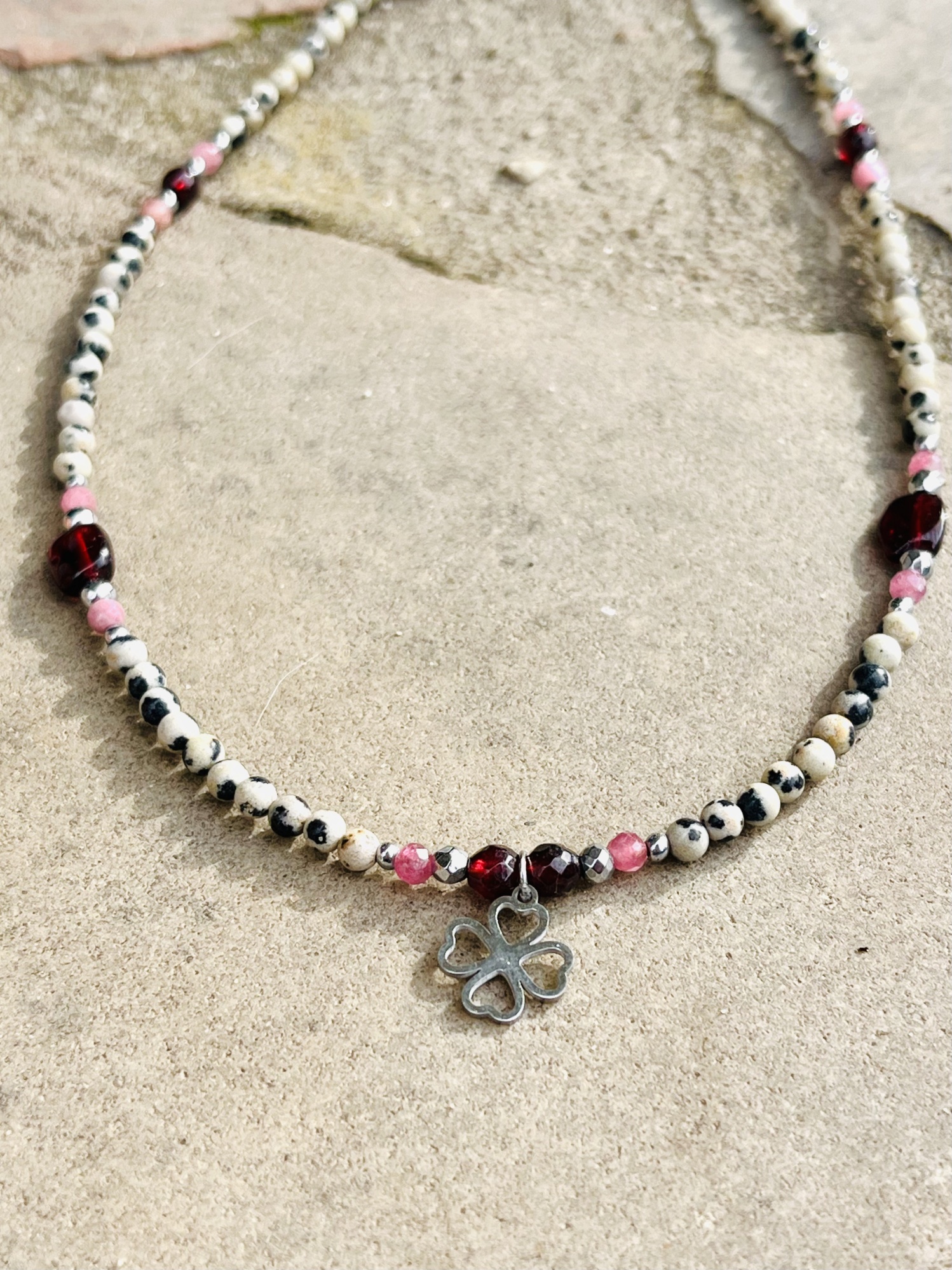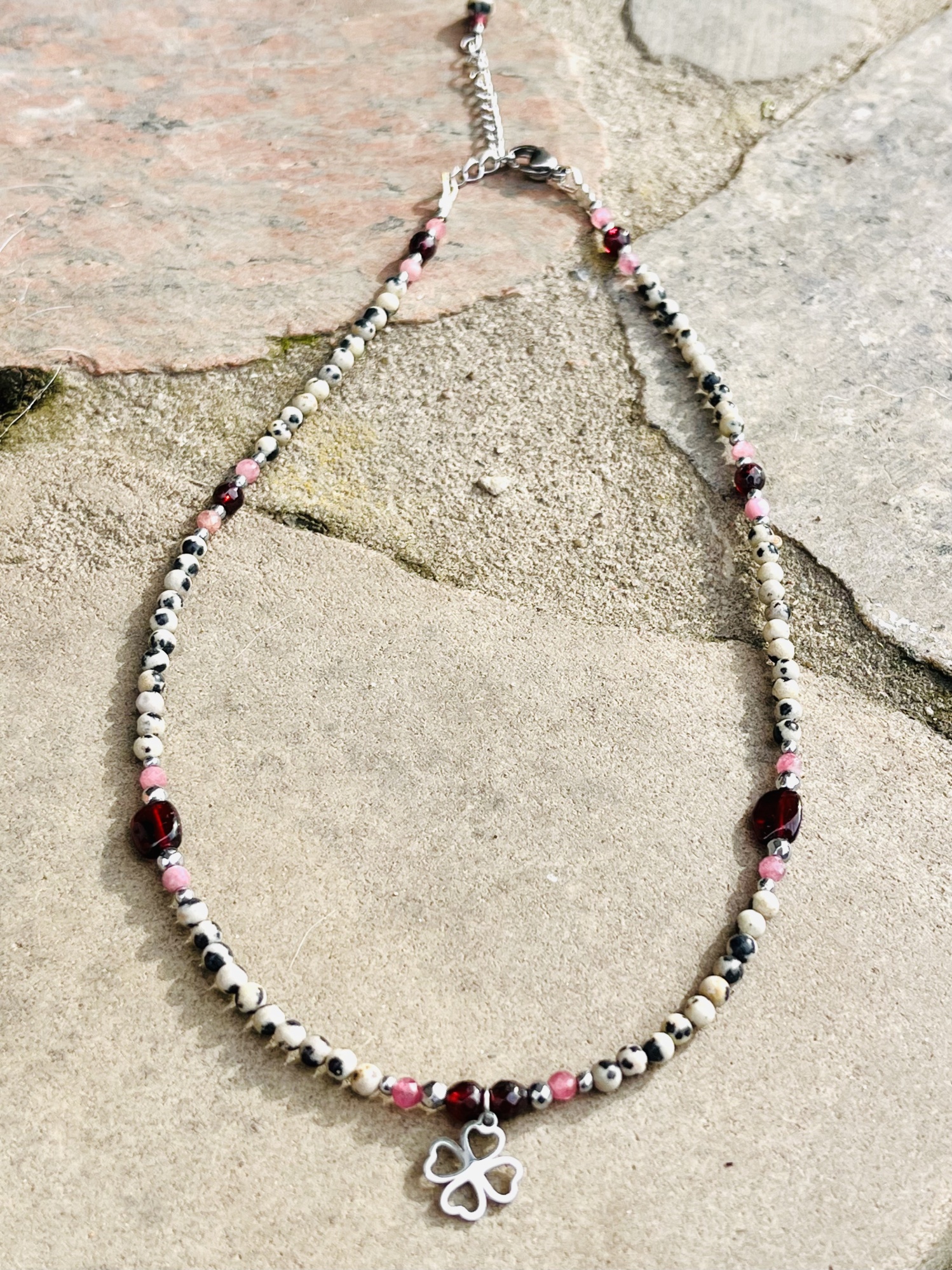 Naszyjnik Chocker z zawieszką koniczynki ze stali chirurgicznej w odcieniu srebrnym wykonany z kamieni jaspisu dalmatyńskiego, bordowego granatu, różowego turmalinu oraz srebrnego hematytu.
