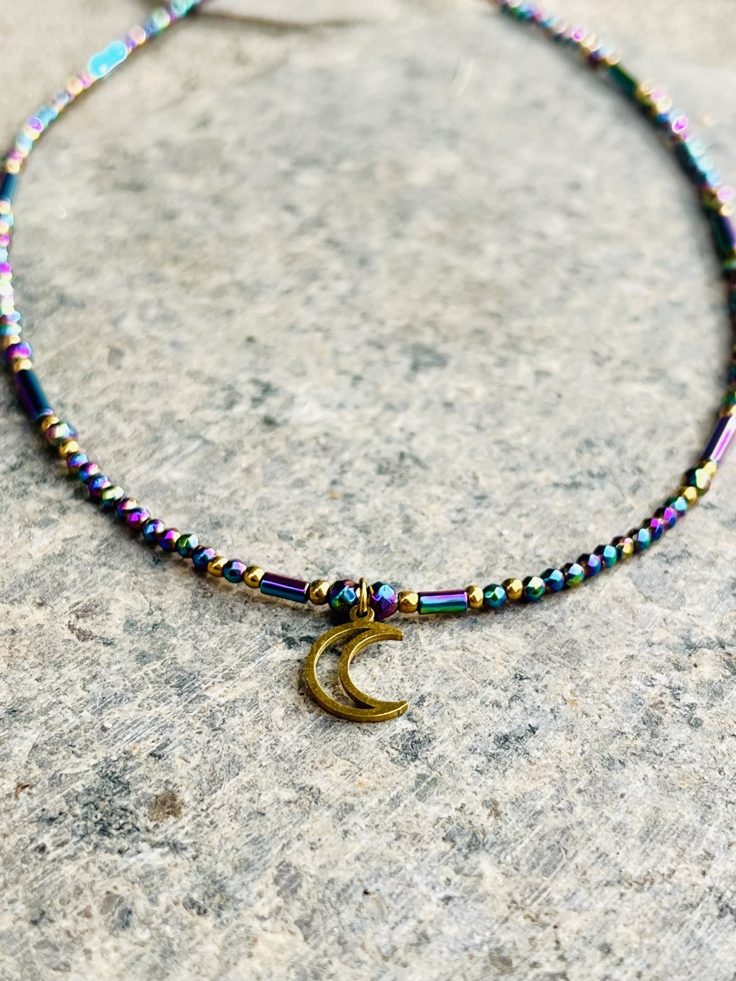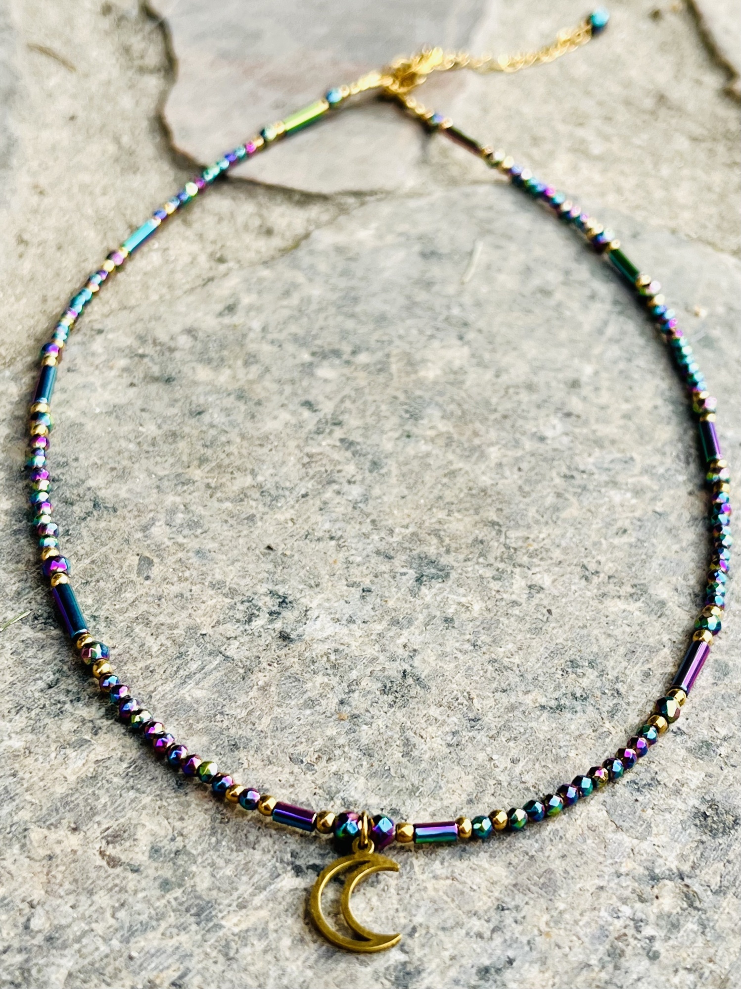 Naszyjnik Chocker z zawieszką małego księżyca ze stali chirurgicznej w złotym odcieniu w otoczeniu kamieni benzynkowego i złotego hematytu.