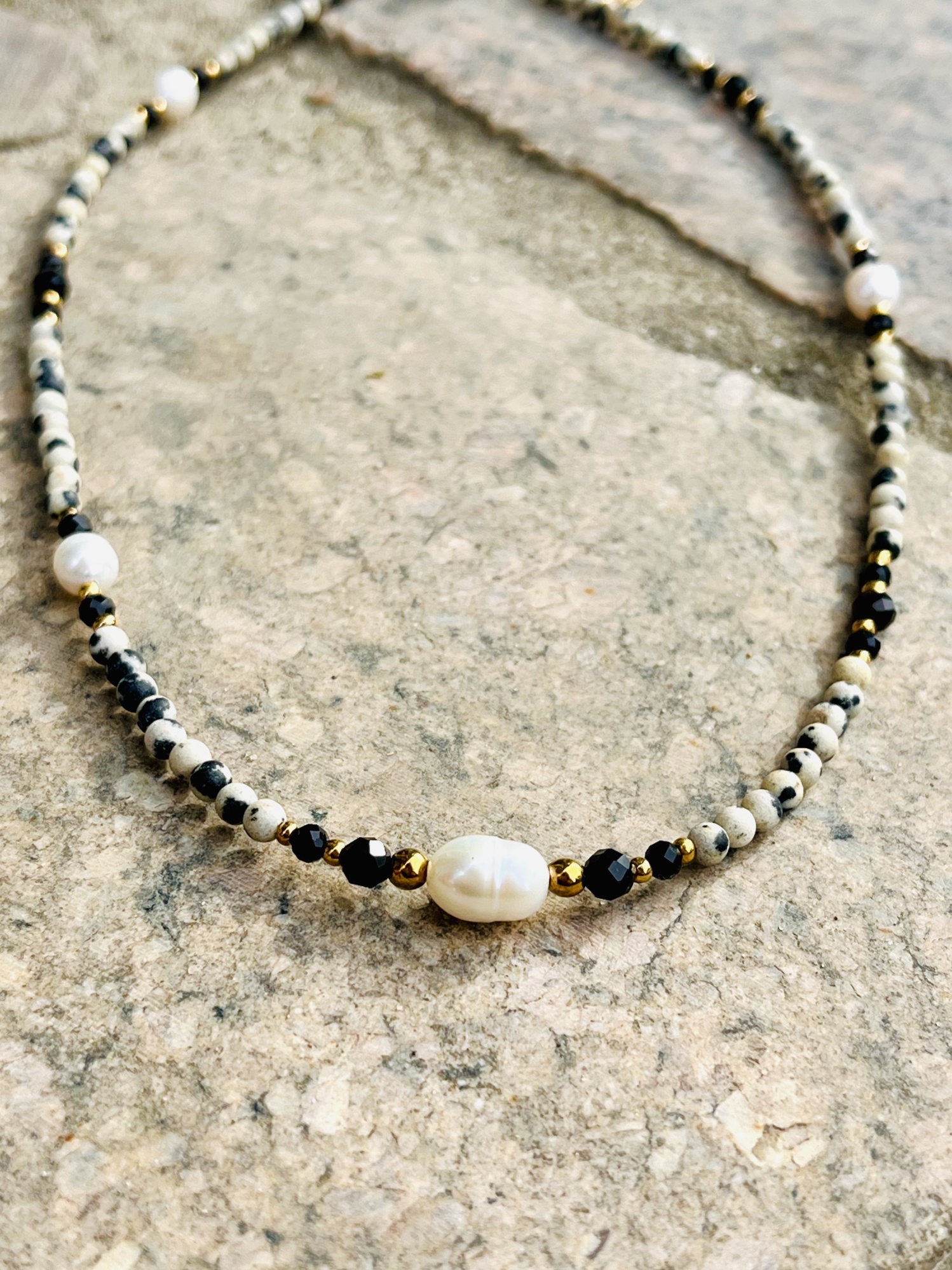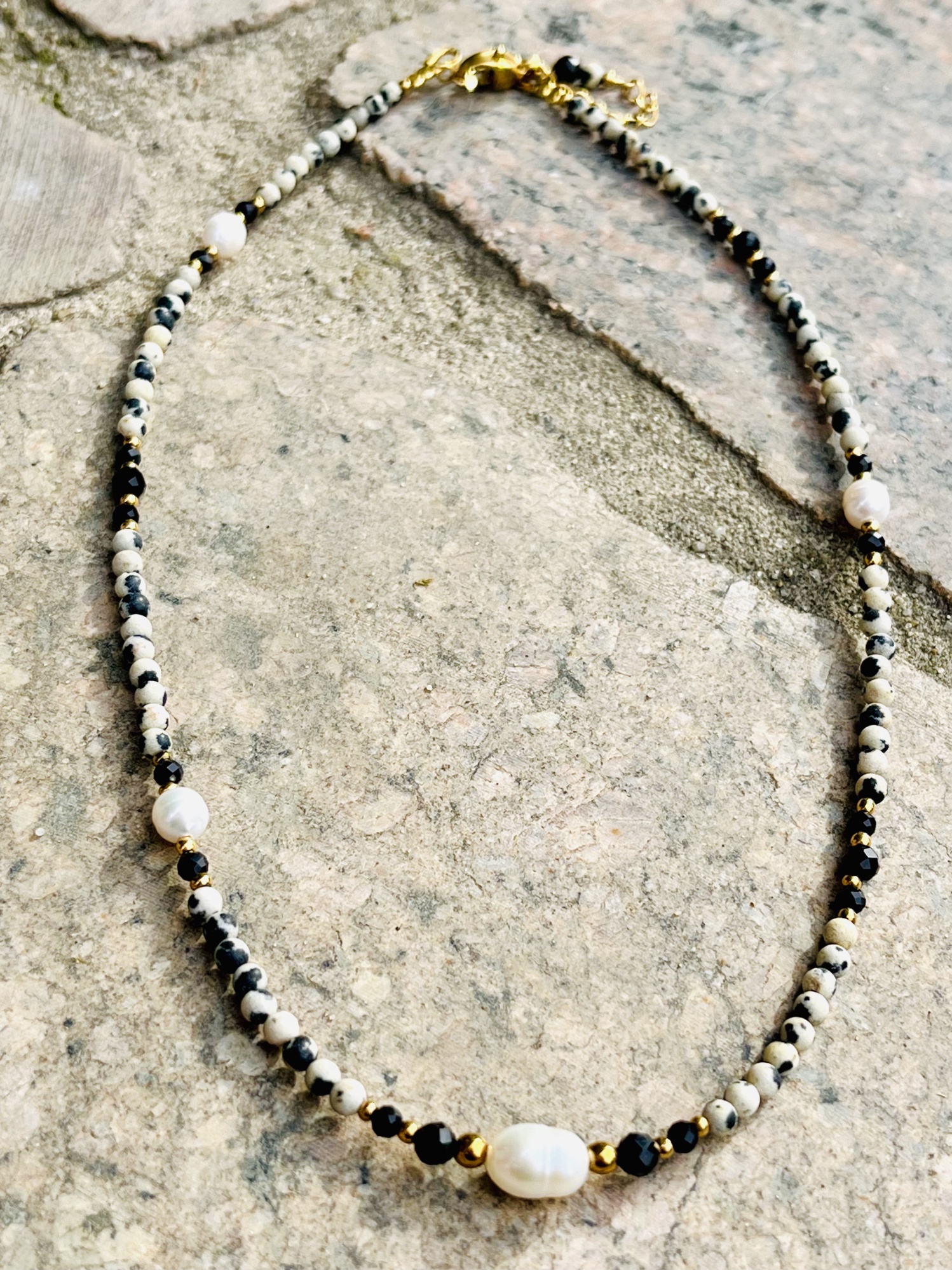 Naszyjnik Chocker z białymi perełkami, jaspisem dalmatyńskim, czarnym onyksem oraz złotym hematytem.