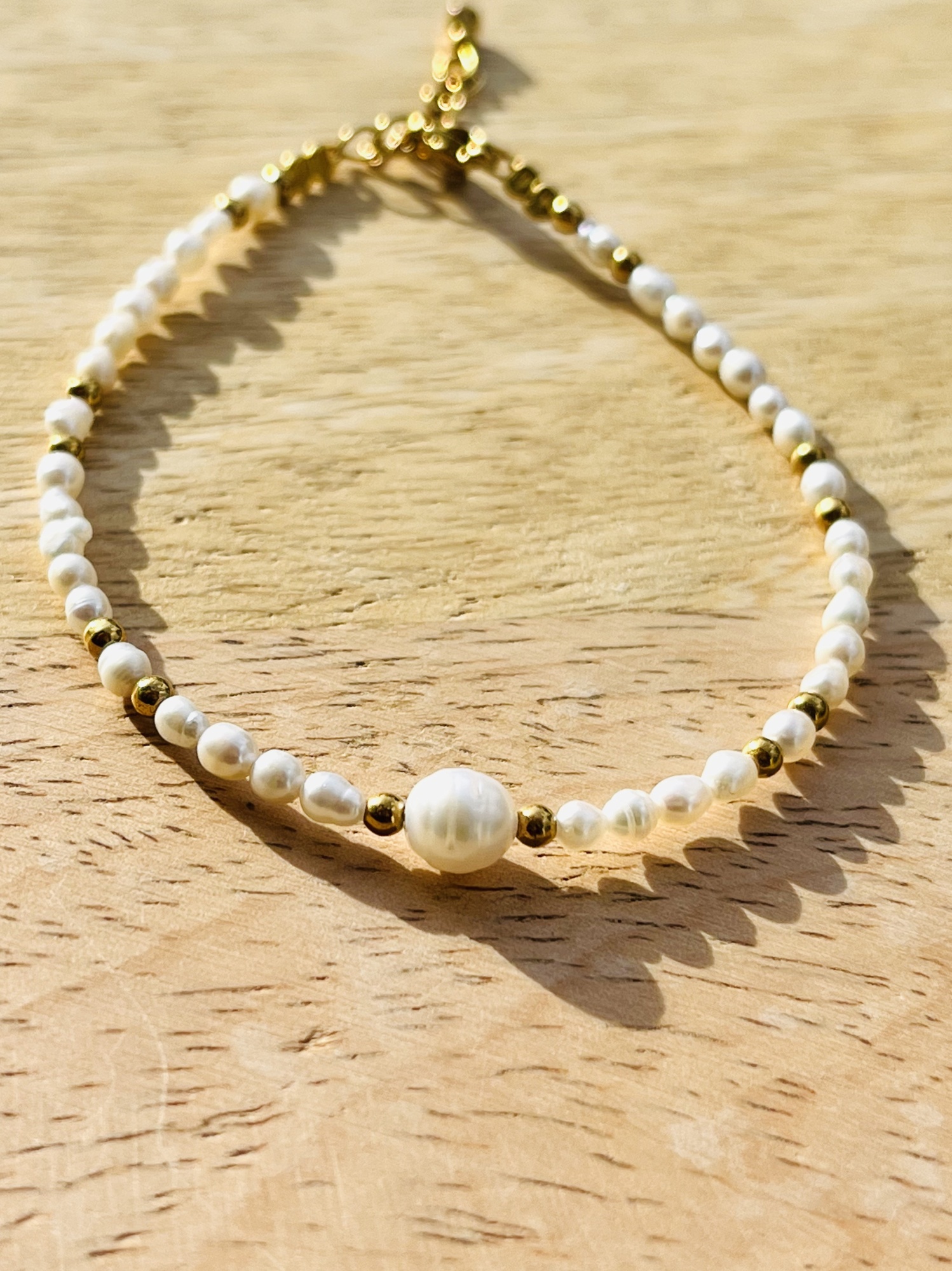 Bransoletka zapinana, wykonana z białej perły w otoczeni drobnych białych perełek oraz złotych kuleczek hematytu. Długość bransoletki 17,5 cm z możliwością przedłużenia łańcuszkiem 2,5cm. Zapięcie oraz łańcuszek ze stali chirurgicznej.