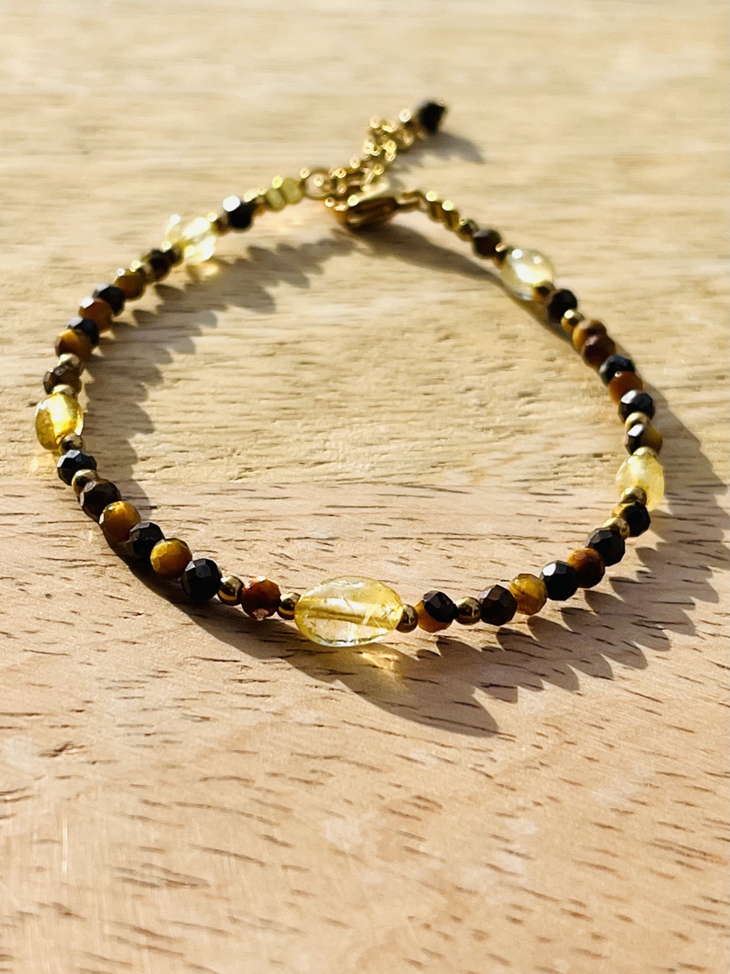 Bransoletka zapinana wykonana z cytrynu w otoczeniu kamieni tygrysiego oka oraz złotych kuleczek hematytu. Długość bransoletki 16,5 cm z możliwością przedłużenia łańcuszkiem 2,5cm. Zapięcie oraz łańcuszek ze stali chirurgicznej.