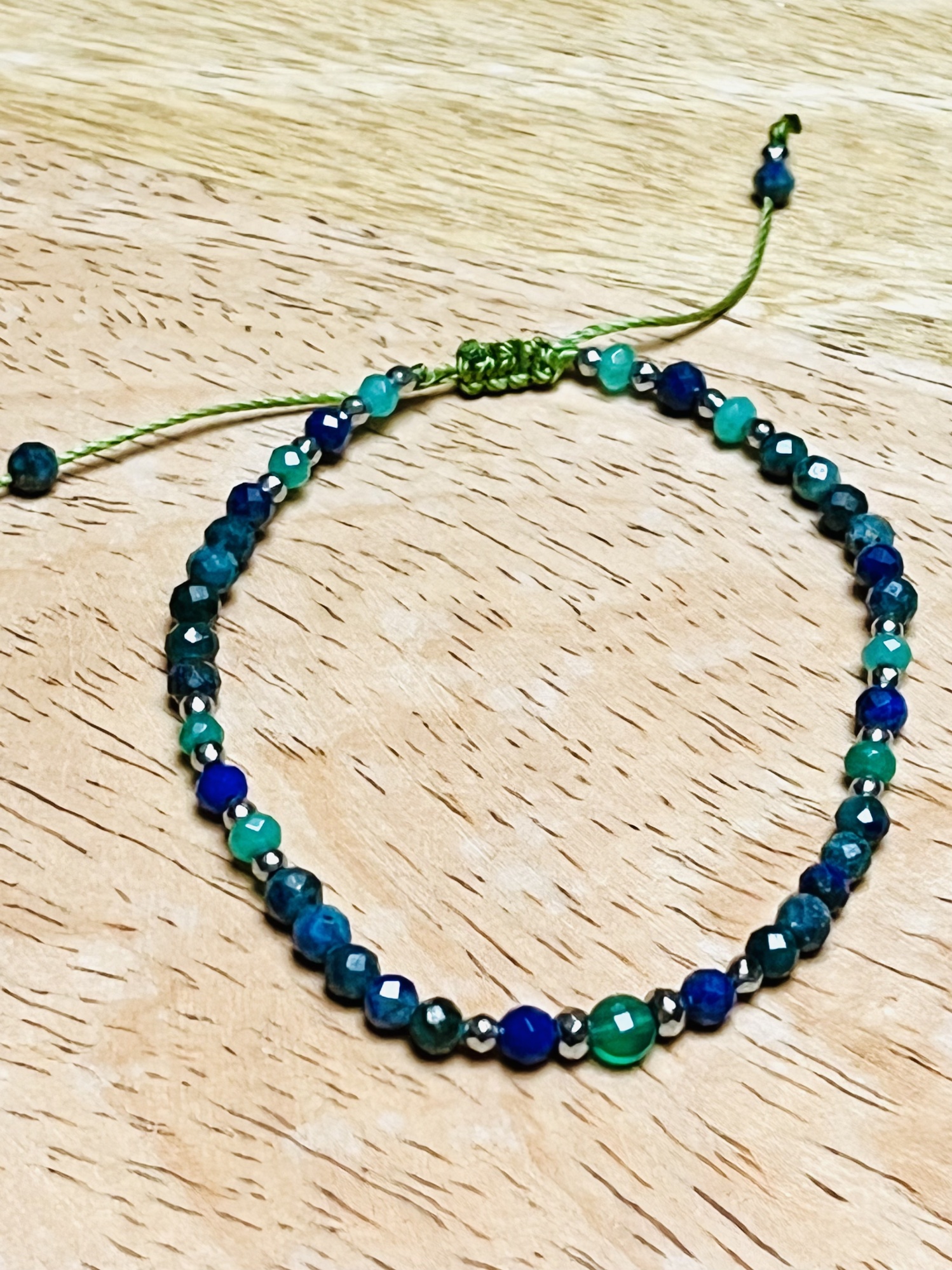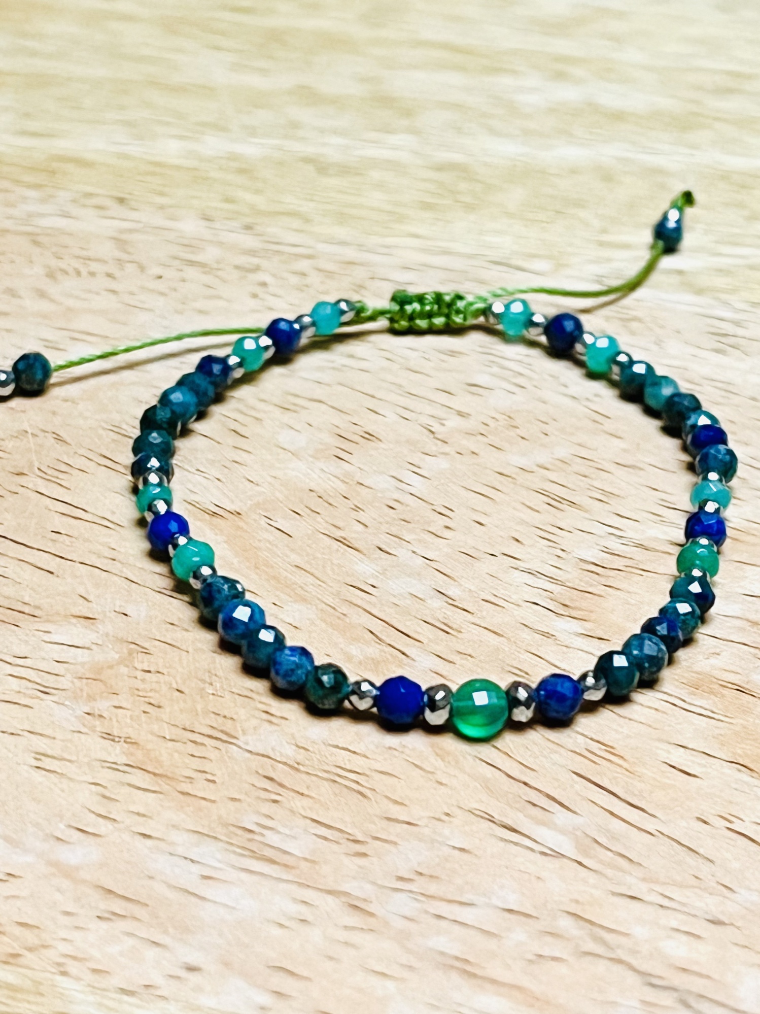 Bransoletka wykonana z granatowo-zielonego azurytu, granatowego lapis lazuli, zielonego agatu z dodatkiem złotego hematytu. Regulowana za pomocą przesuwanej makramy. Wykonana na zielonym nylonowym sznureczku.
