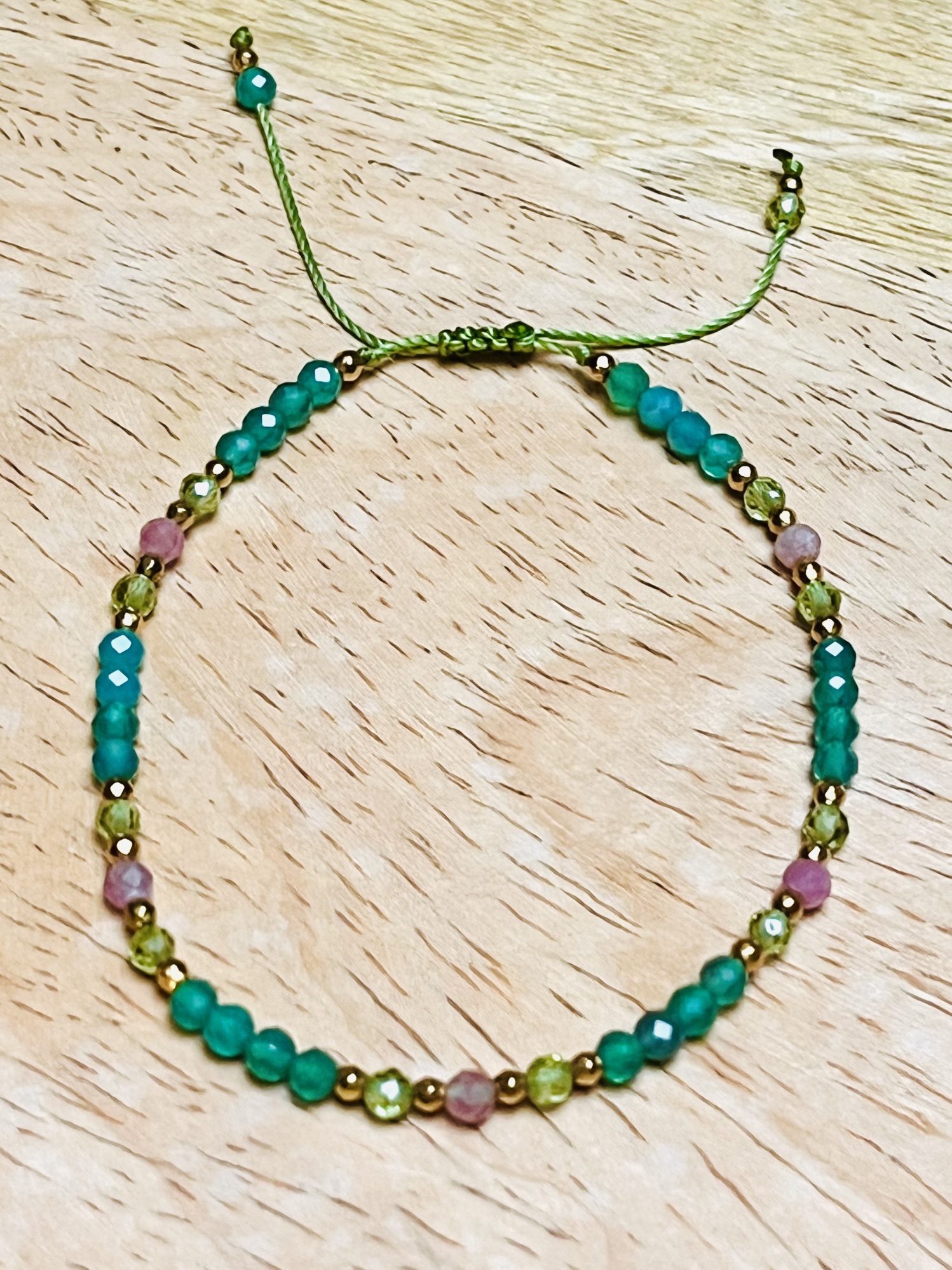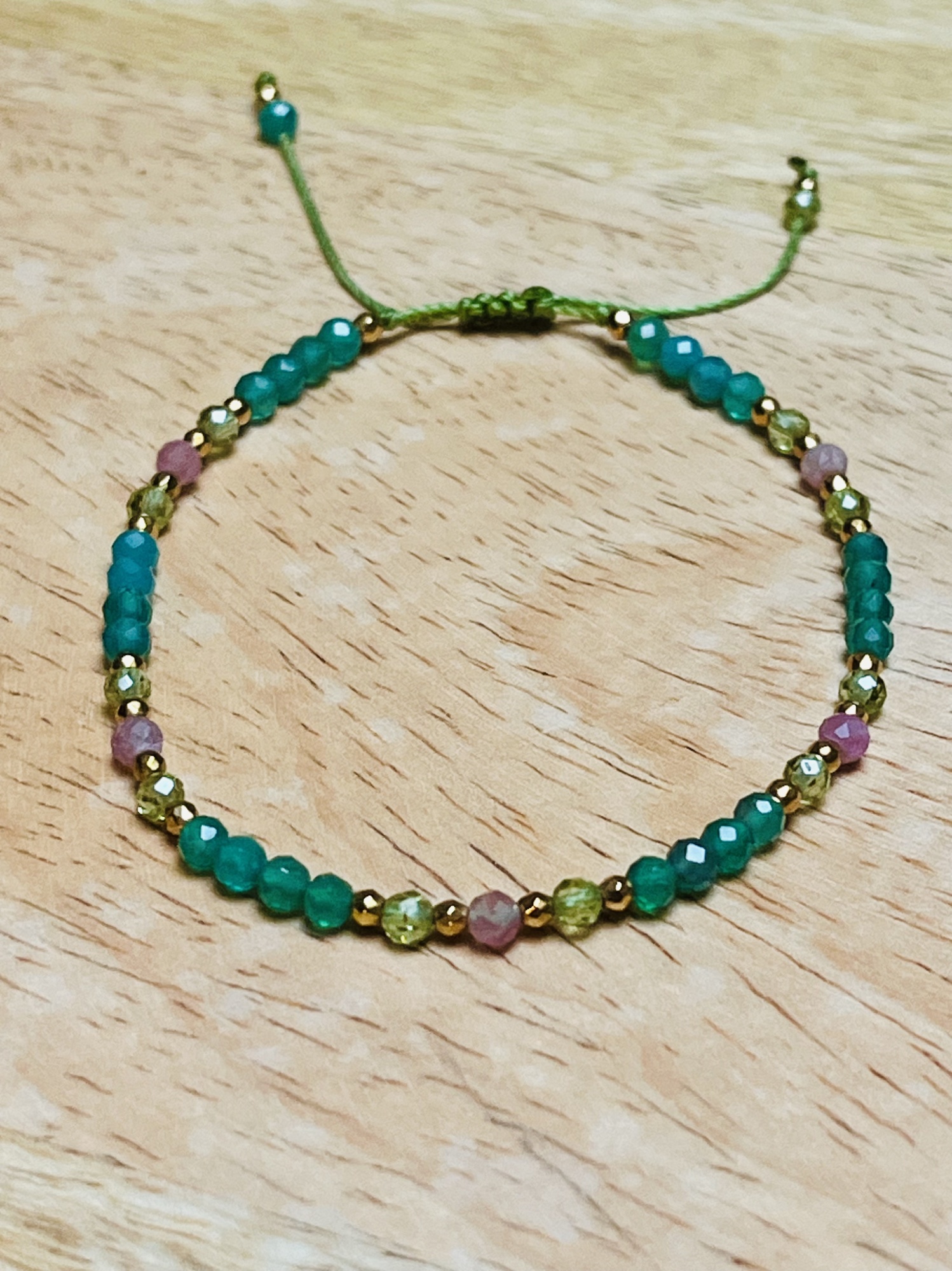 Bransoletka wykonana z kamieni zielonego agatu, różowego turmalinu, oliwinu z dodatkiem złotego hematytu. Regulowana za pomocą przesuwanej makramy. Wykonana na zielonym nylonowym sznureczku.