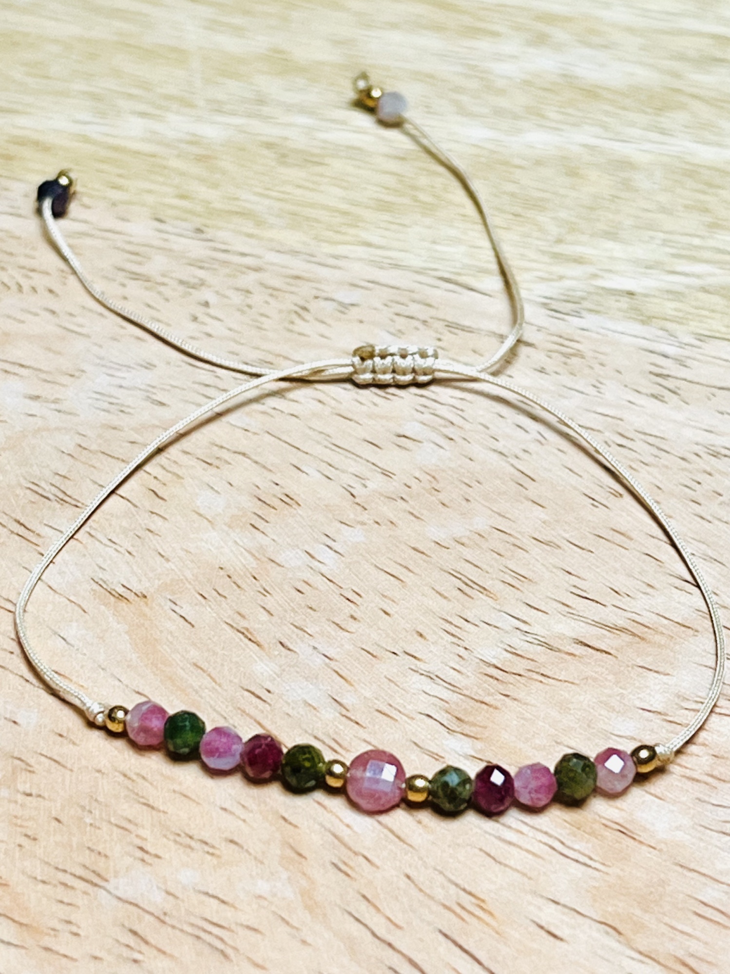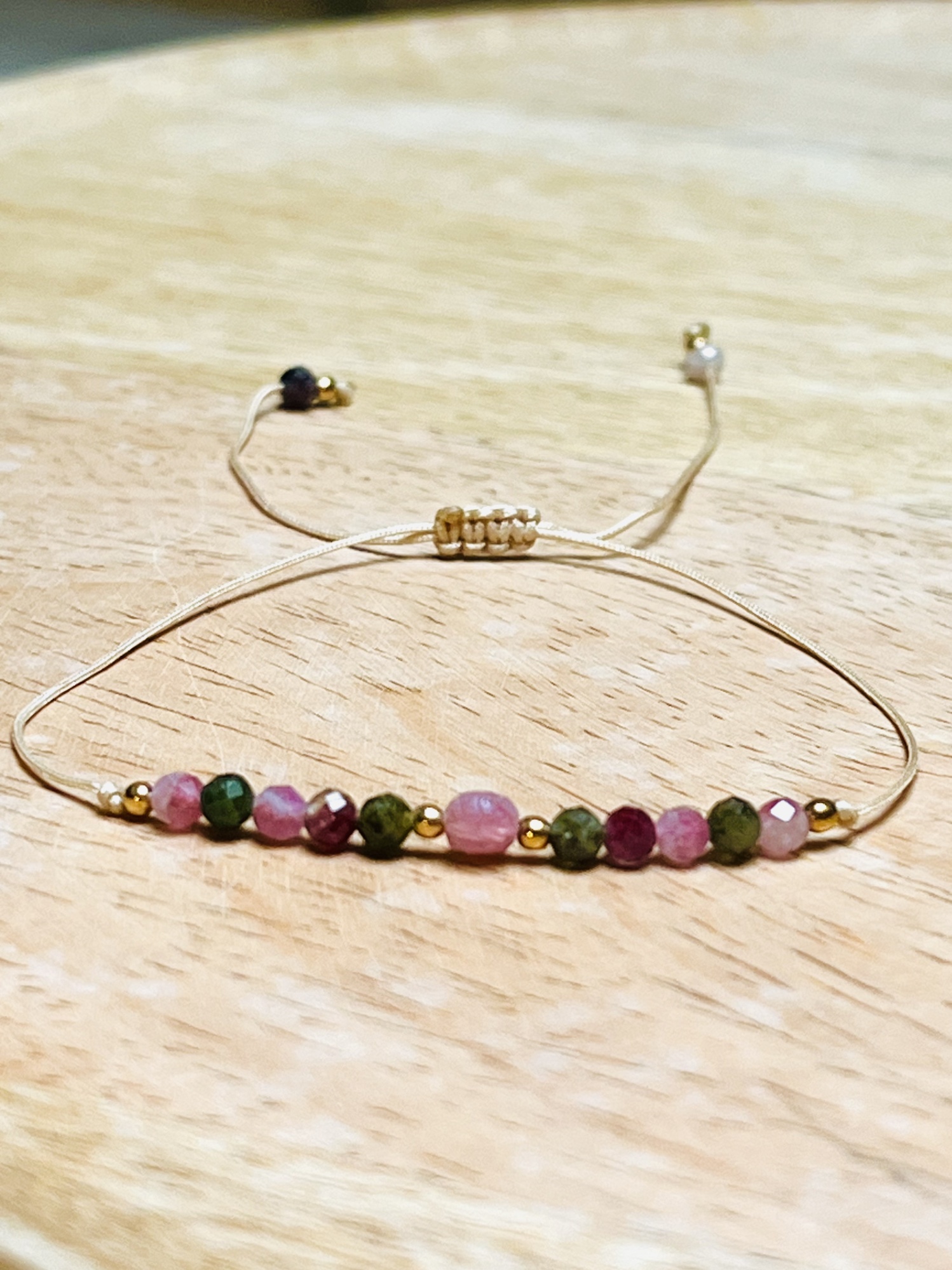 Bransoletka mini wykonana z kamieni kolorowego turmalinu z dodatkiem złotego hematytu. Regulowana za pomocą przesuwanej makramy. Wykonana na jasnym nylonowym sznureczku.