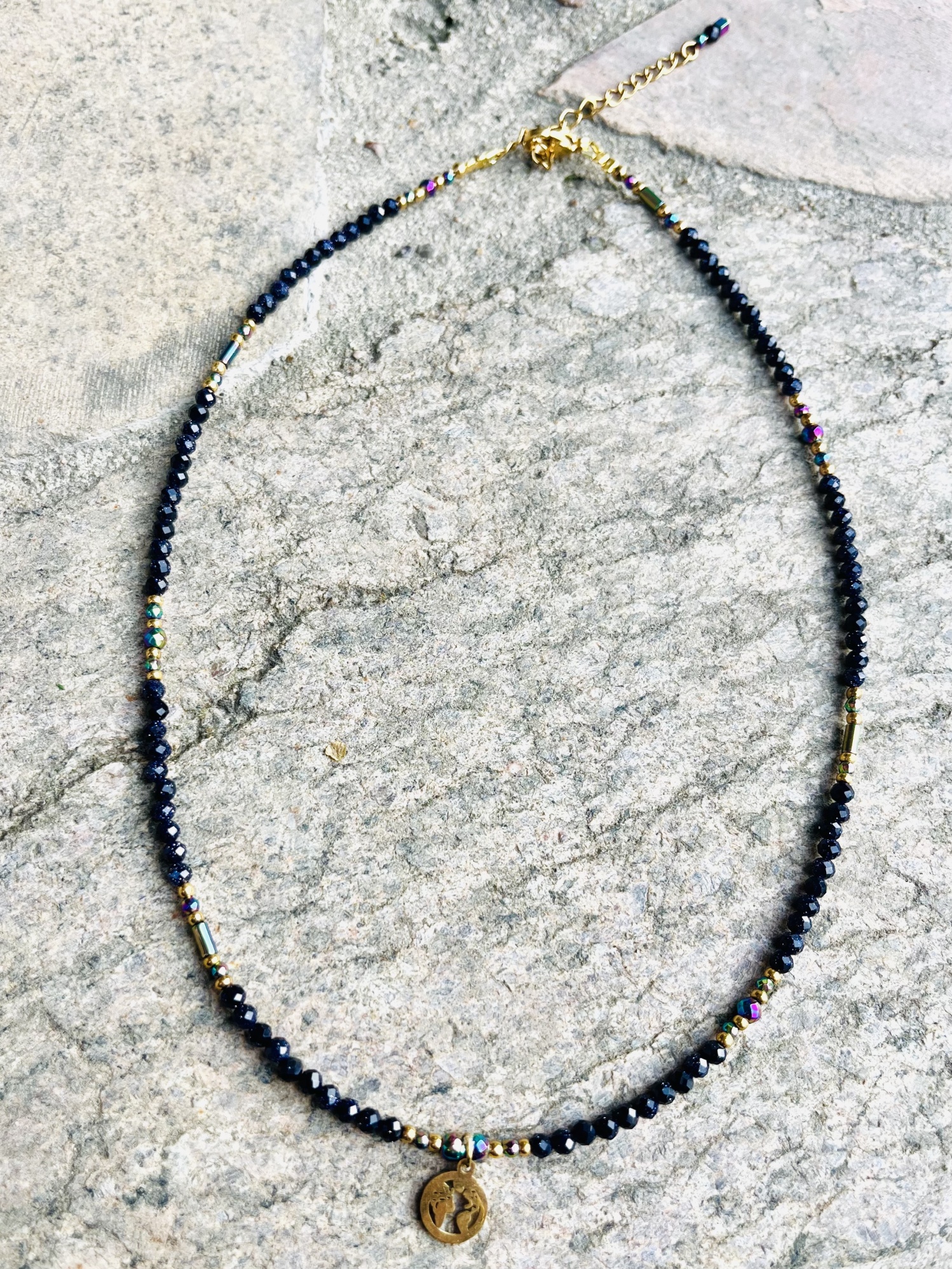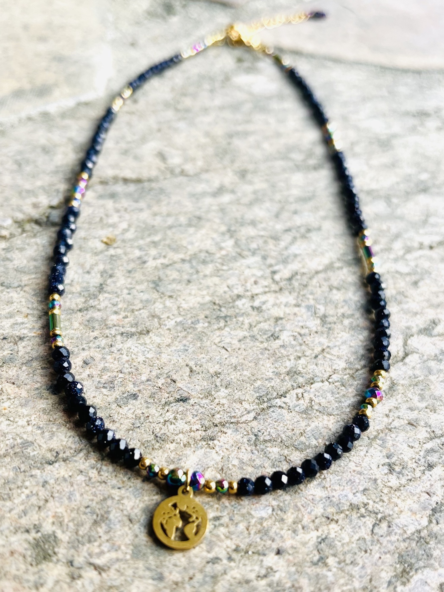 Naszyjnik Chocker z zawieszką symbolu kuli ziemskiej ze stali chirurgicznej w złotym odcieniu w otoczeniu kamieni granatowej, mieniącej się drobinkami nocy Kairu, hematytu benzynkowego mieniącego się w różnych barwach oraz złotego hematytu.