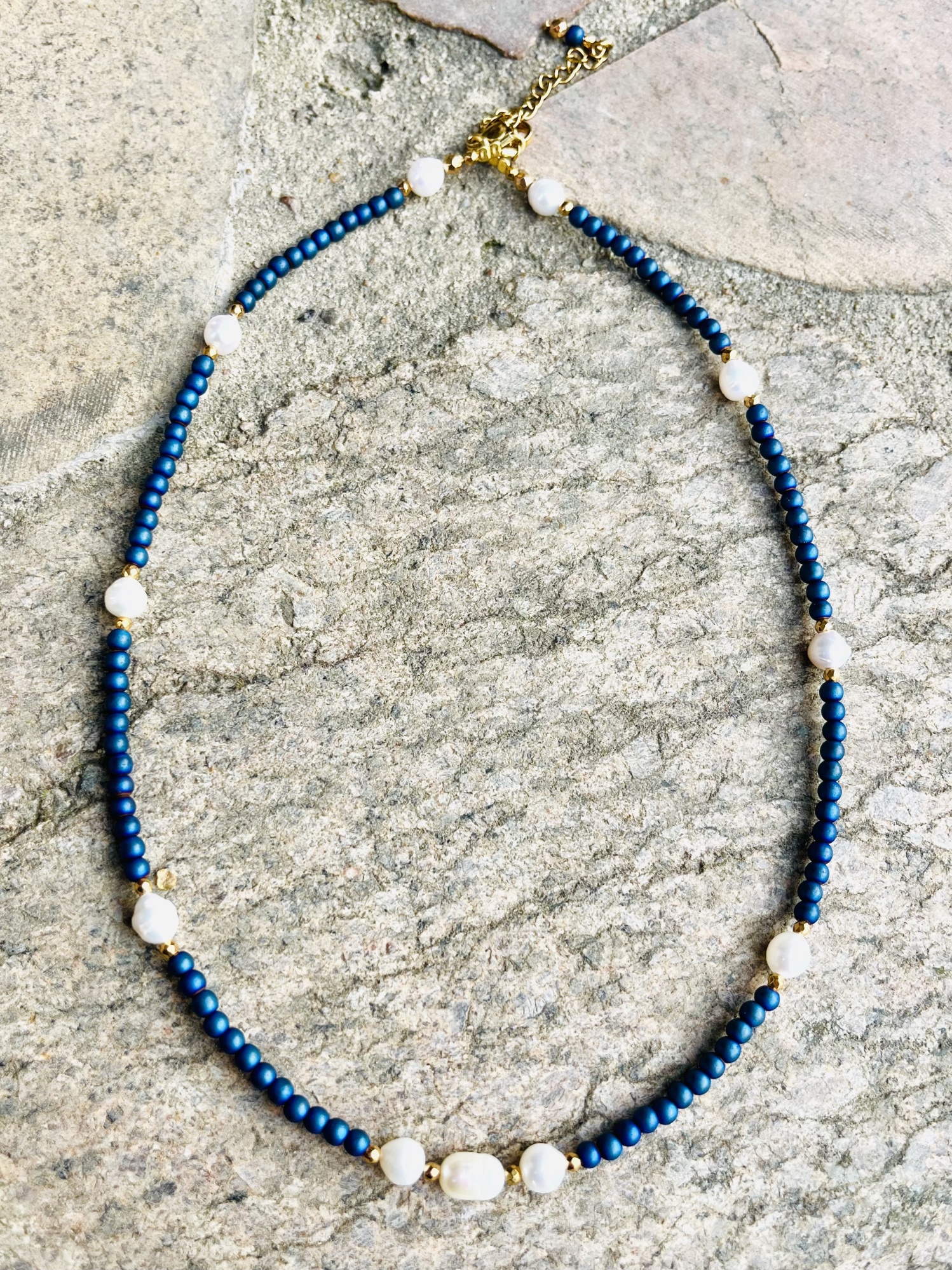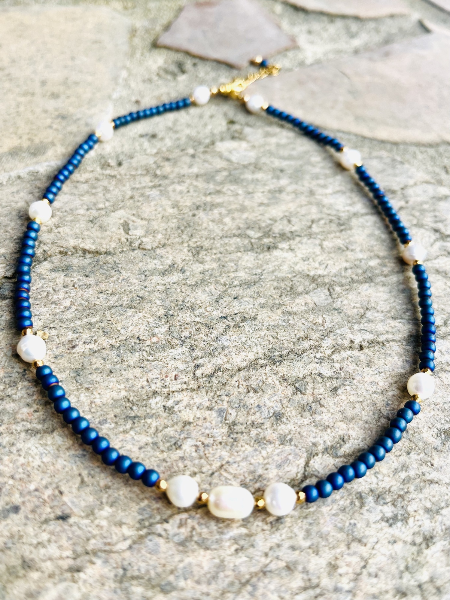 Naszyjnik Chocker z białymi perełkami w otoczeniu granatowego matowego hematytu oraz złotego hematytu.