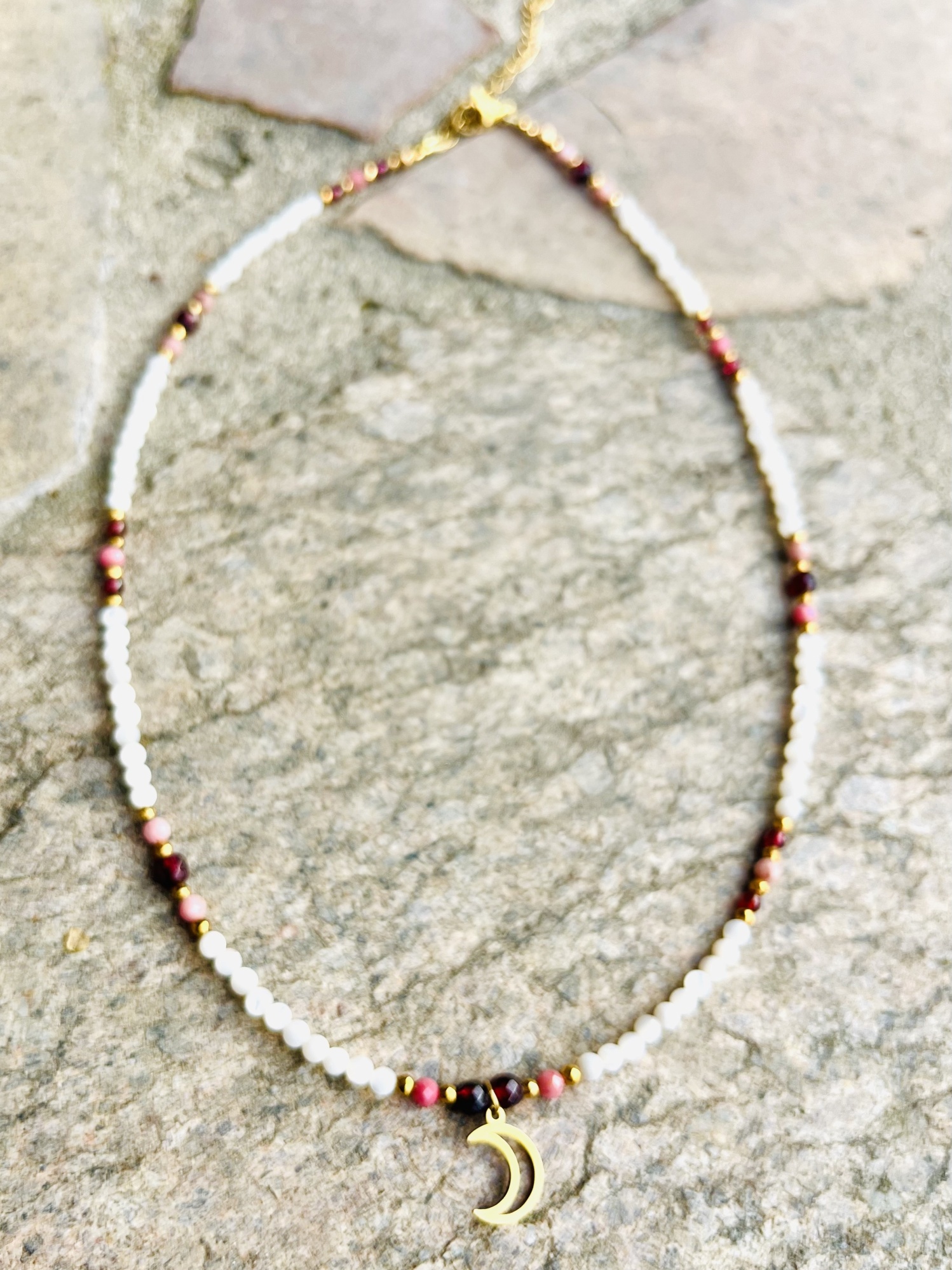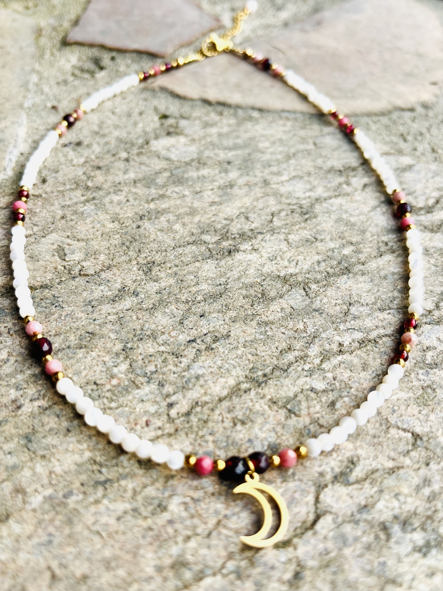 Naszyjnik Chocker z zawieszką symbolu Półksiężyca w otoczeniu kamieni bordowego granatu, różowego rodonitu, białej masy perłowej oraz złotego hematytu.