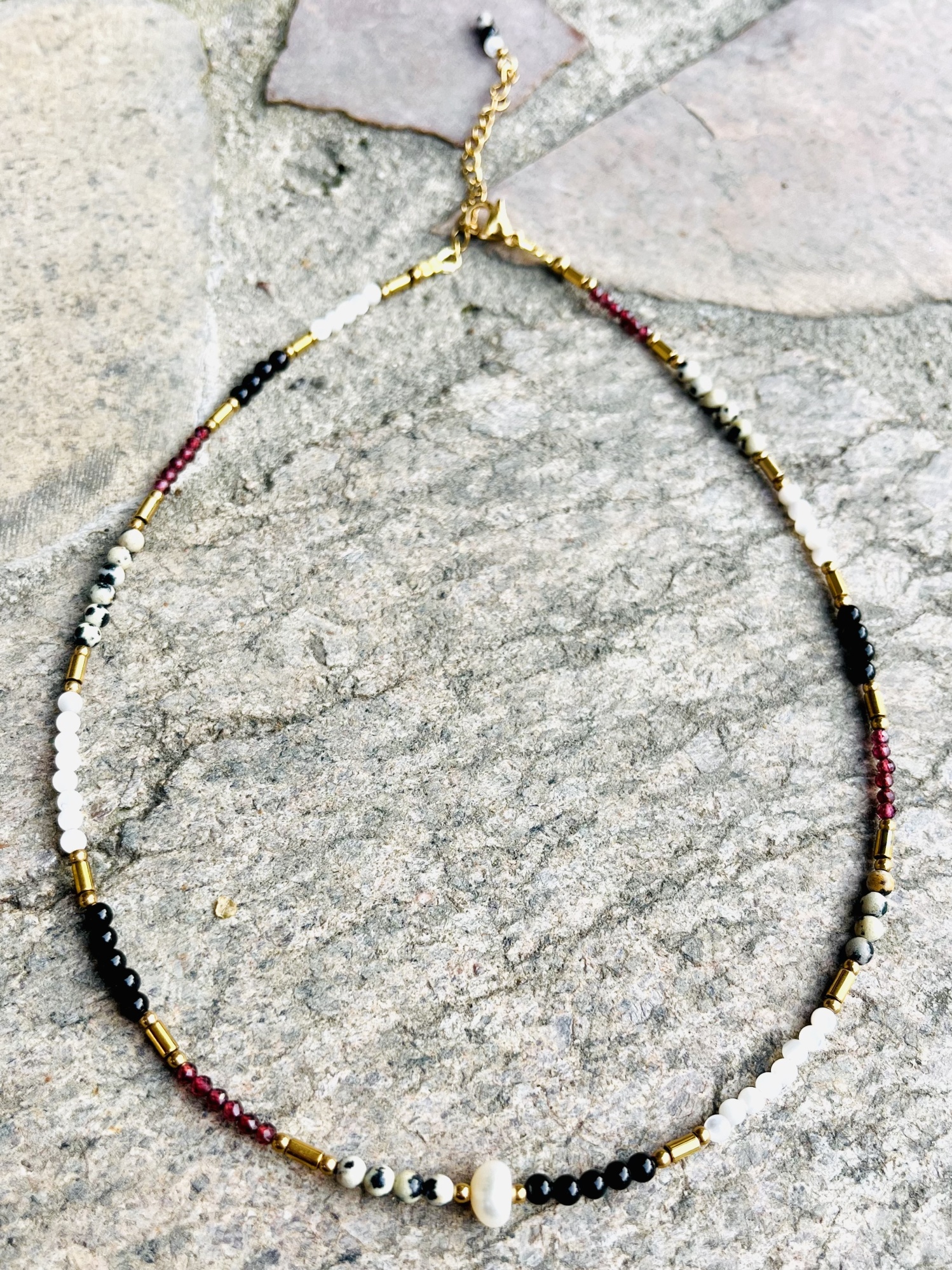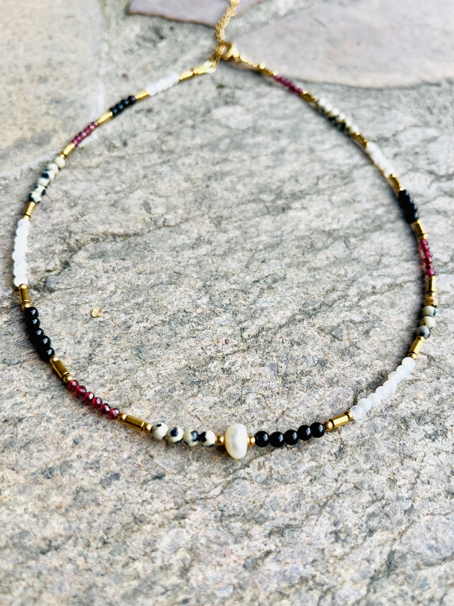 Naszyjnik Chocker z białą perełką w otoczeniu czarnego onyksu, bordowego granatu, jaspisu dalmatyńskiego, białej masy perłowej oraz złotego hematytu.