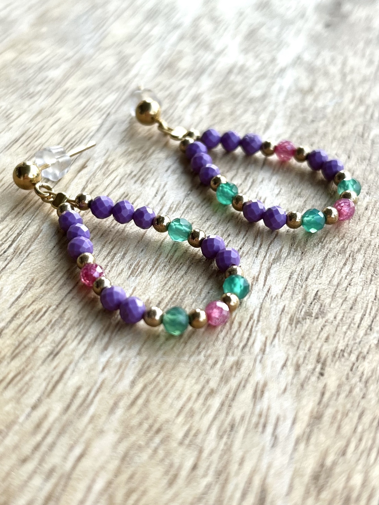 Kolczyki wiszące w kształcie łezki z kamieniem fioletowego fosforyderytu, zielonego agatu, różowej cyrkonii w otoczeniu złotego hematytu. Sztyft kuleczka ze stali chirurgicznej. Długość ok 3,2cm