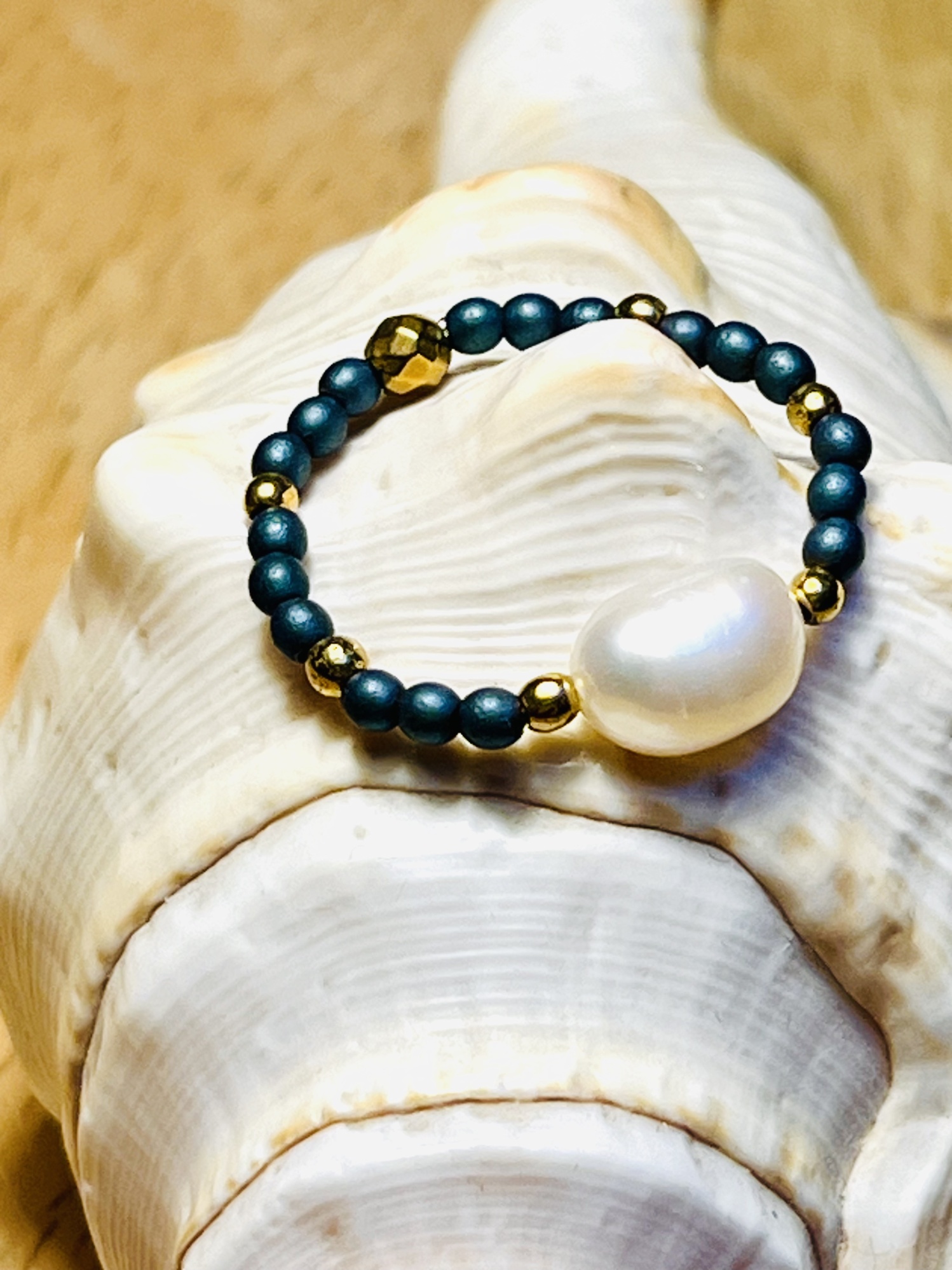Pierścionek elastyczny wykonany z białą dużą perełką w otoczeniu granatowego-matowego i złotego hematytu.