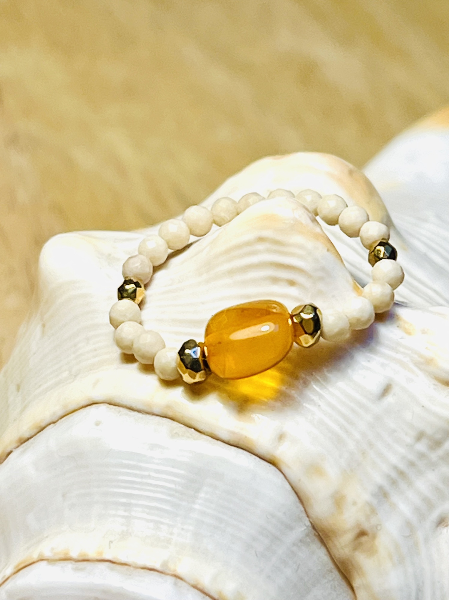 Pierścionek elastyczny wykonany z bursztynkiem w otoczeniu kamienia rzecznego oraz złotego hematytu.