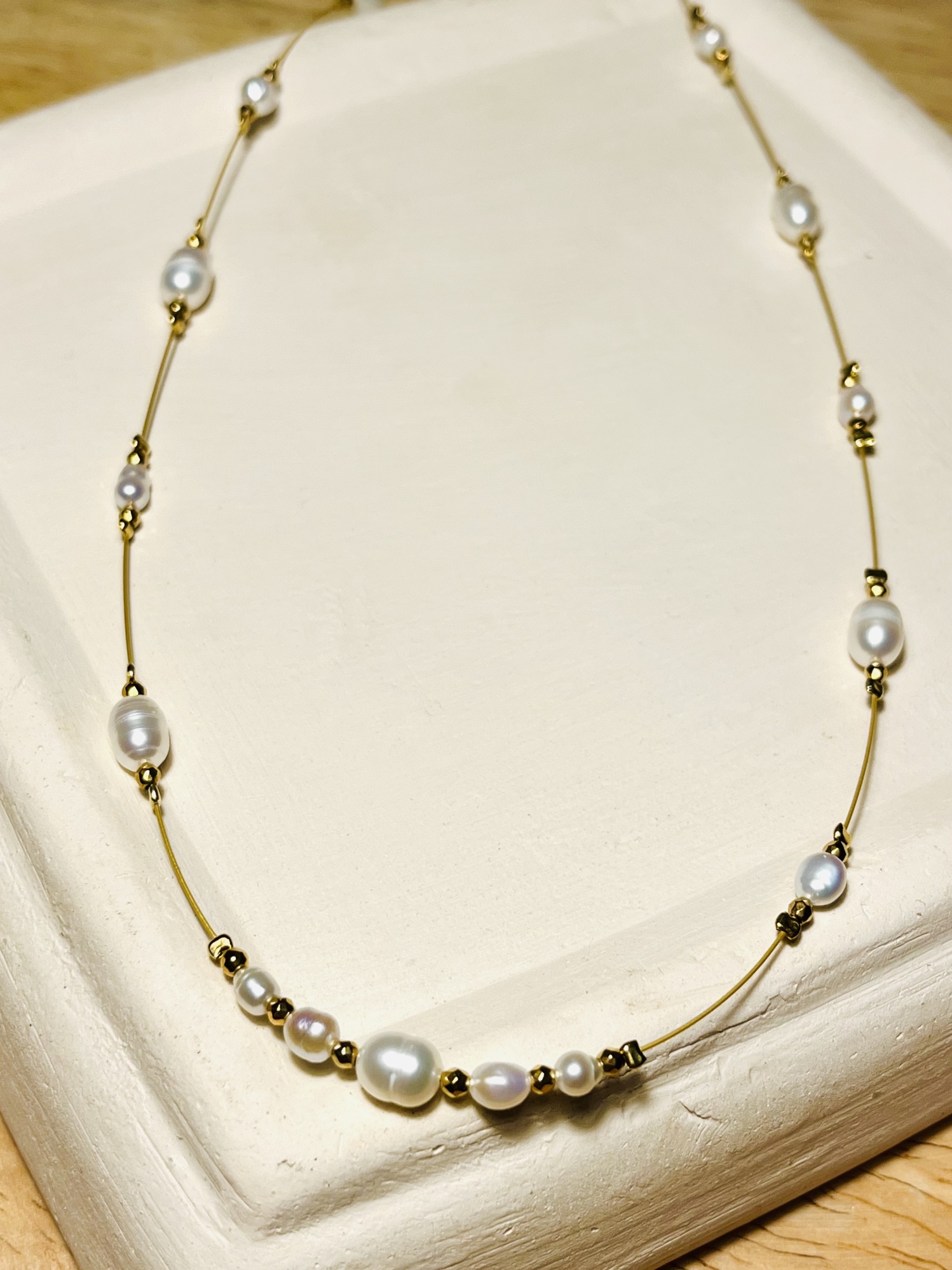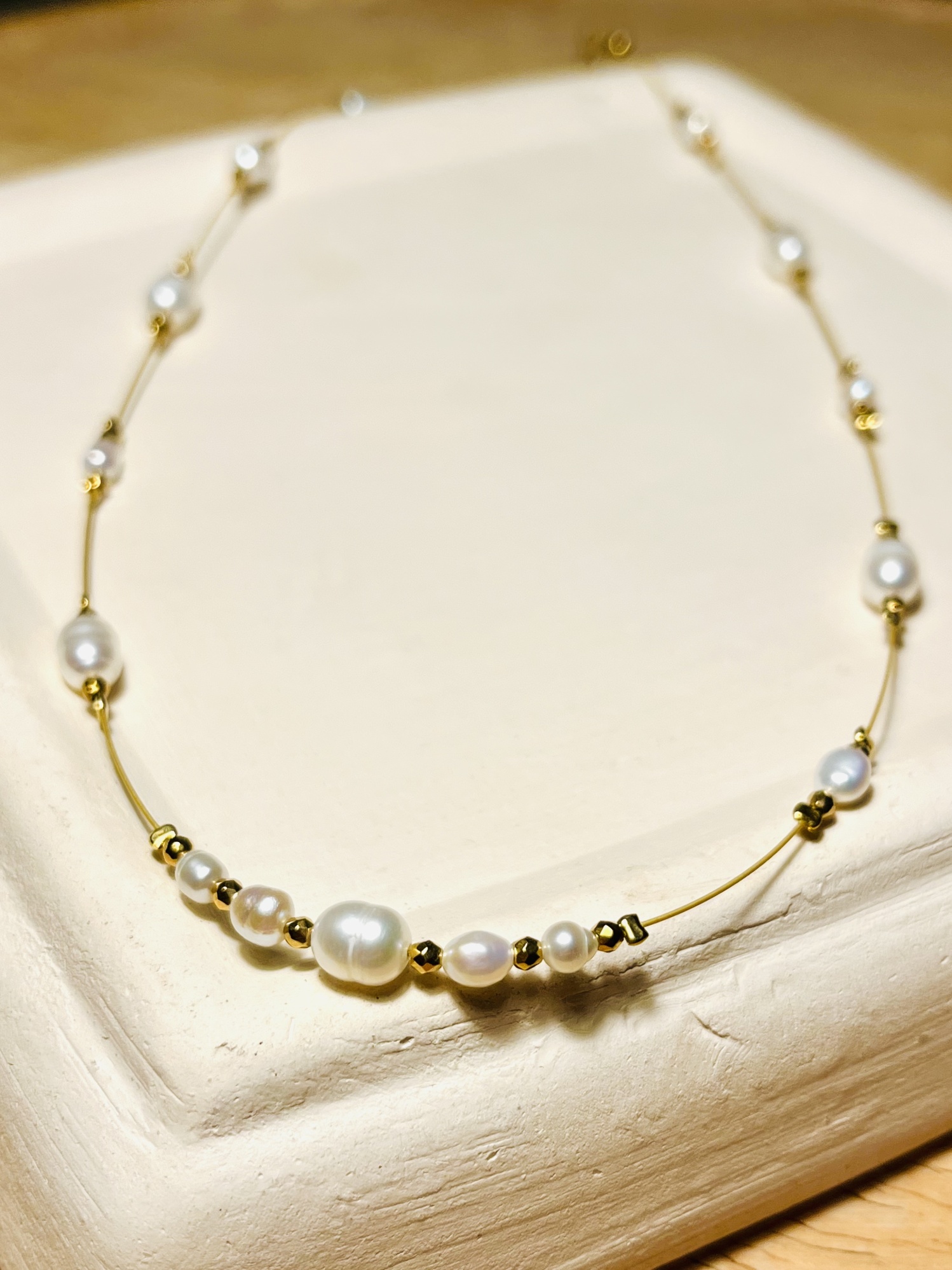 Naszyjnik Mgiełka wykonany z małych, nieregularnych, białych perełek oraz złotego hematytu.
